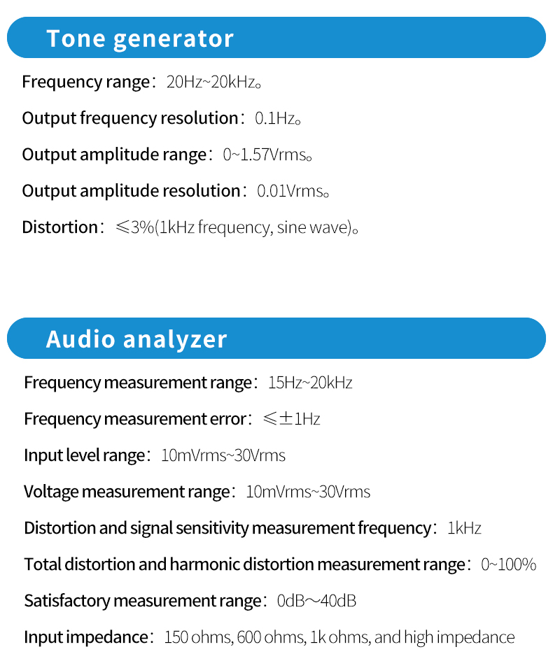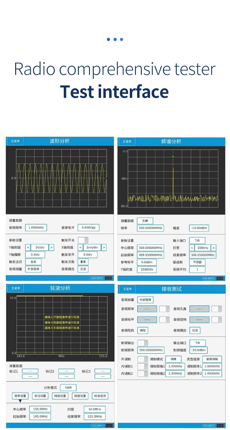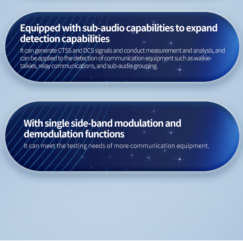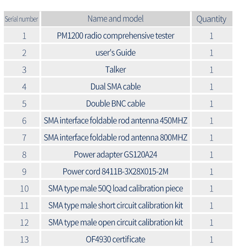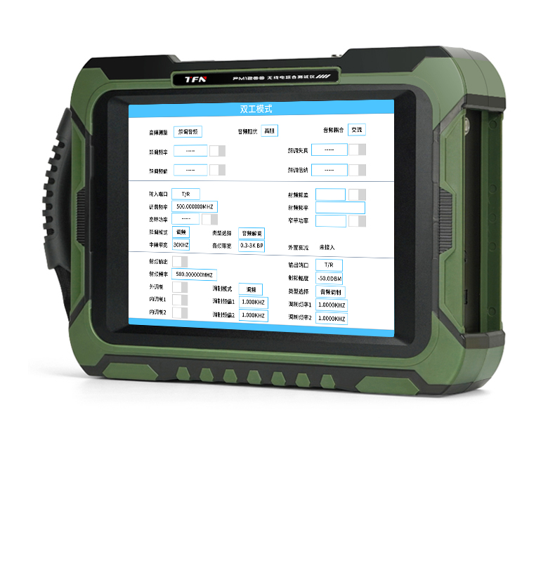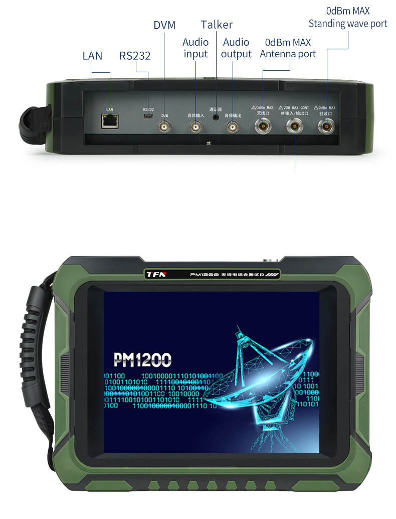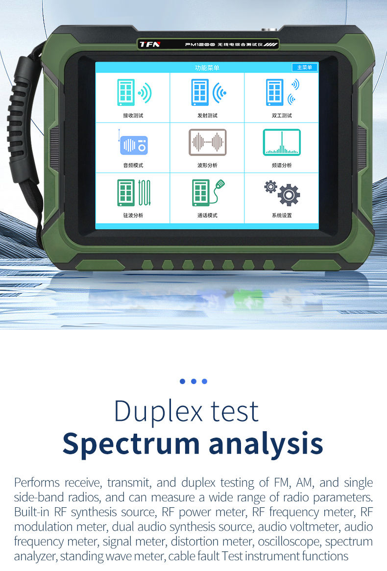 PM1200 Handheld Radio Comprehensive Tester The product frequency range is 2MHz~1300MHz. It can perform reception, transmission and duplex test on FM, AM and SSB radio stations, and can measure a variety of radio parameters. It has built-in RF synthesis source, RF power meter, RF frequency meter, RF modulation meter, dual audio synthesis source, audio voltmeter, audio frequency meter, signal-to-noise meter, distortion meter, oscilloscope, spectrum analyzer, standing wave meter, cable fault detector and other test instrument functions.
