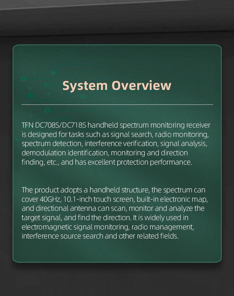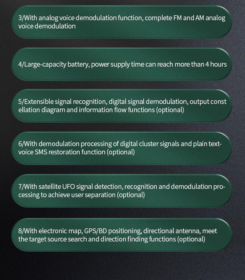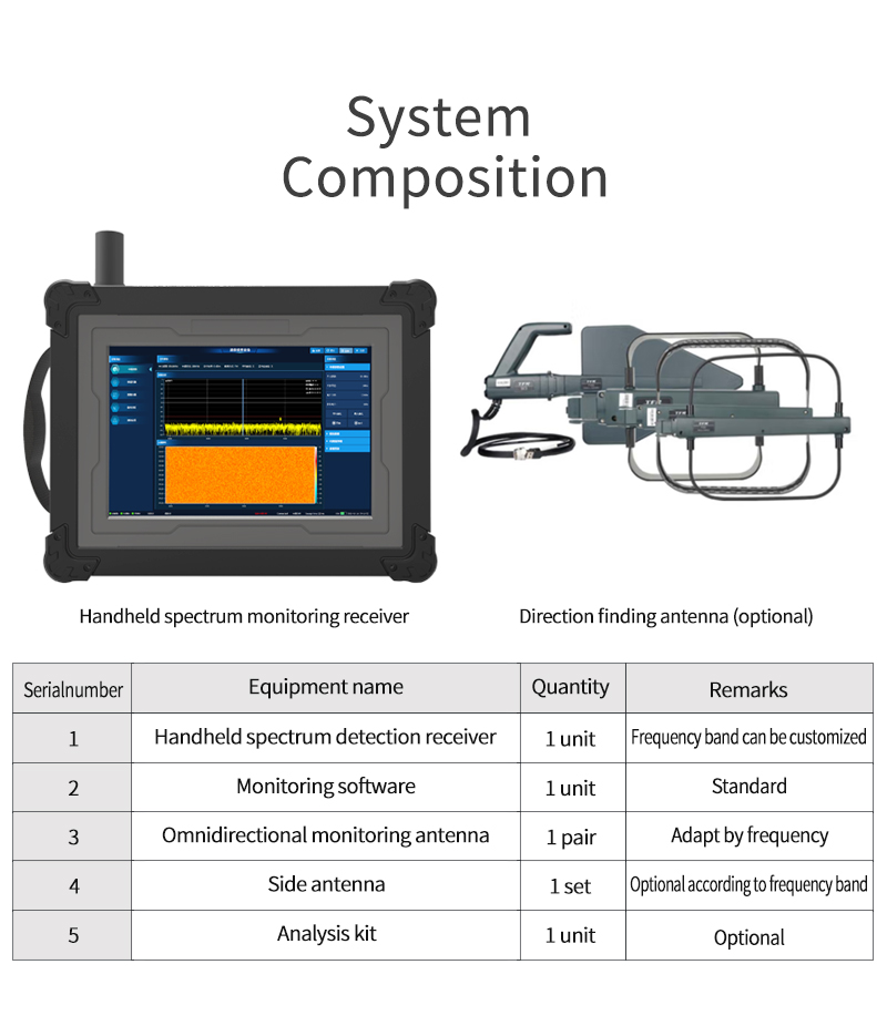 The portable electromagnetic spectrum monitoring receiver is designed for tasks such as signal search, radio monitoring, eavesdropping detection, security investigation, and interference verification. It can complete tasks such as signal analysis, demodulation analysis, and spectrum storage.