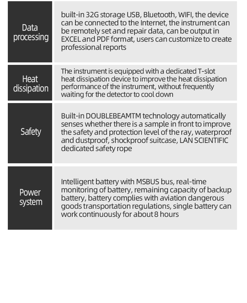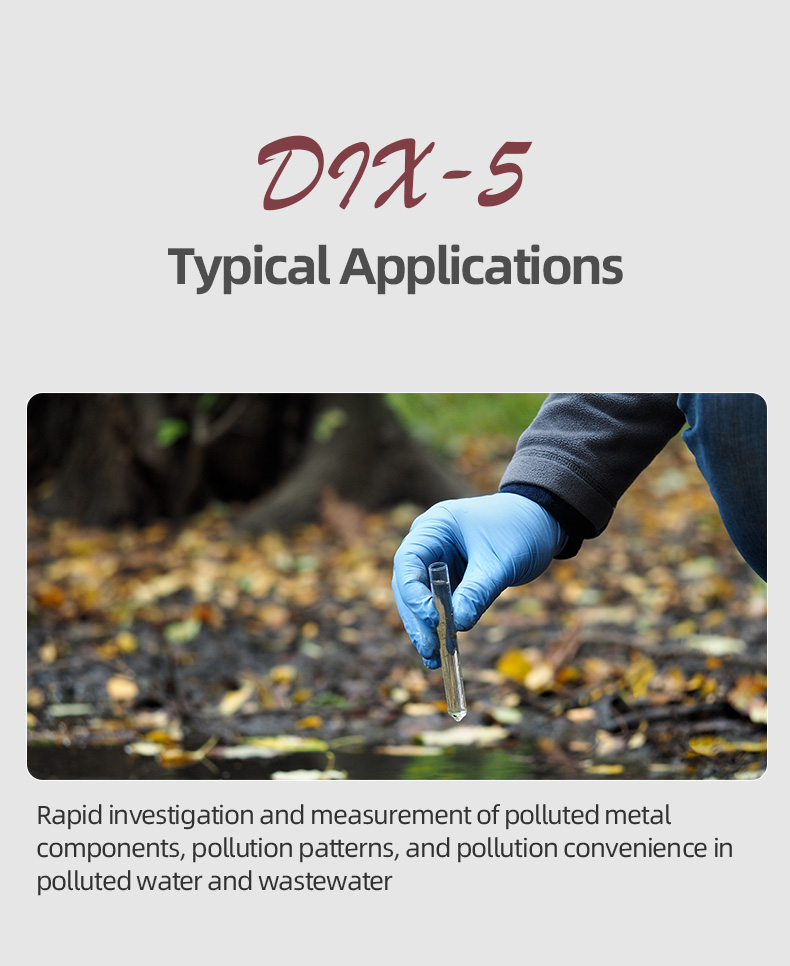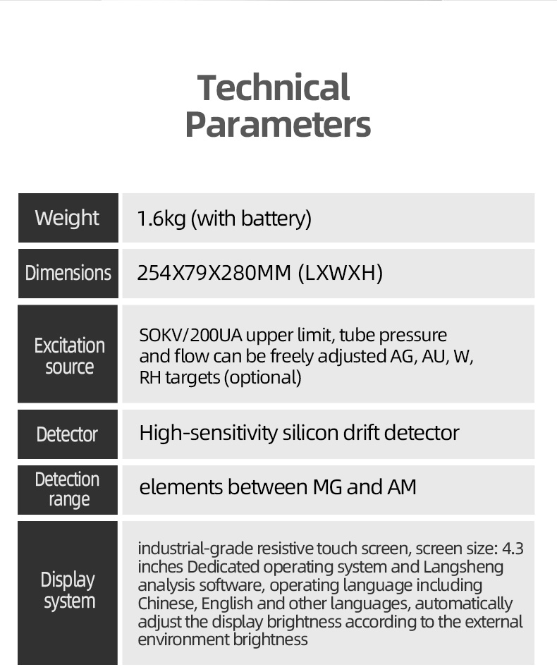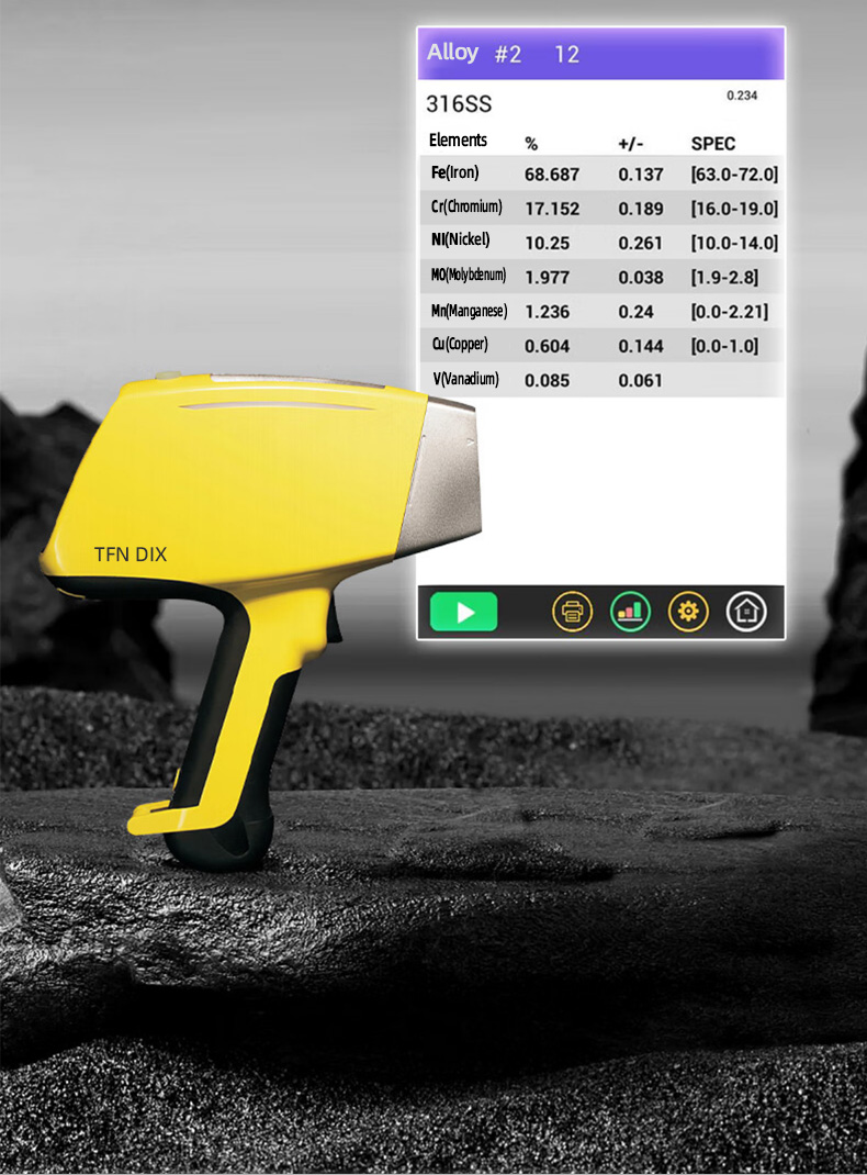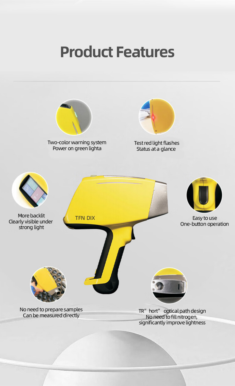 The TFN DIX handheld X-ray fluorescence analyzer weighs 1.5kg and is highly flexible and portable. The TFN DIX handheld analyzer uses a new high-speed digital multi-channel technology, a new brand library recognition system, and Super-FP algorithm processing technology. Compared with similar products on the market, the DIX handheld analyzer has faster measurement speed, higher measurement accuracy, and stronger measurement consistency. The instrument is not only small in size, light in weight, and has excellent performance, but also has a wide range of applications. It can meet users' limited detection and analysis needs for multiple elements such as Mg, Al, Si, P, S, Ti, Ni, Cu, etc., and can also customize the best solution according to customer needs.