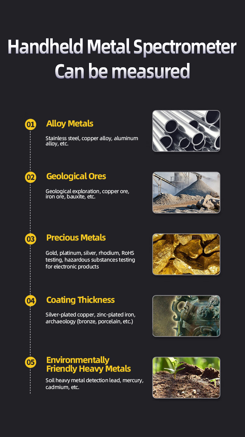 Measurable: alloy metals, geological ores, precious metals, environmental heavy metals, etc.