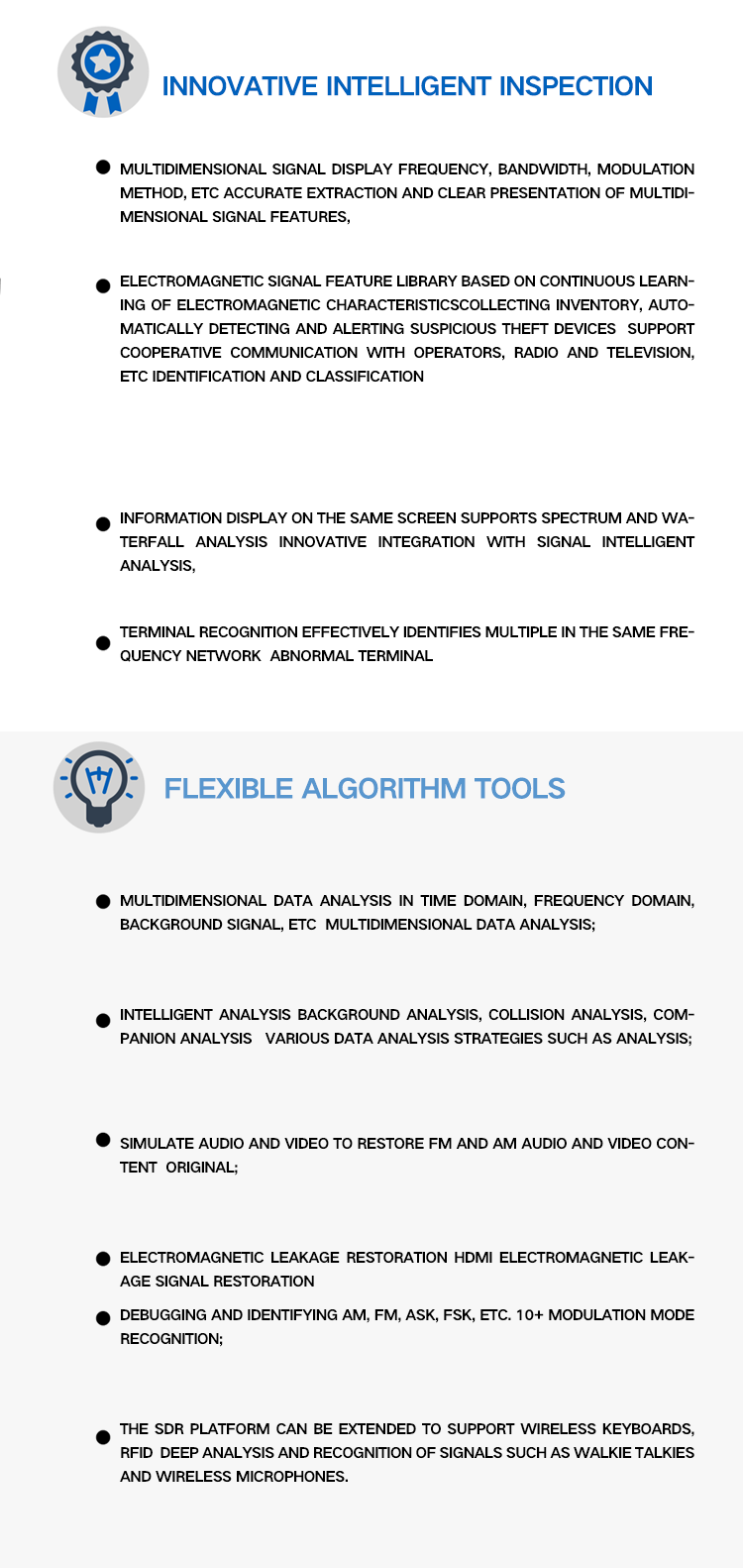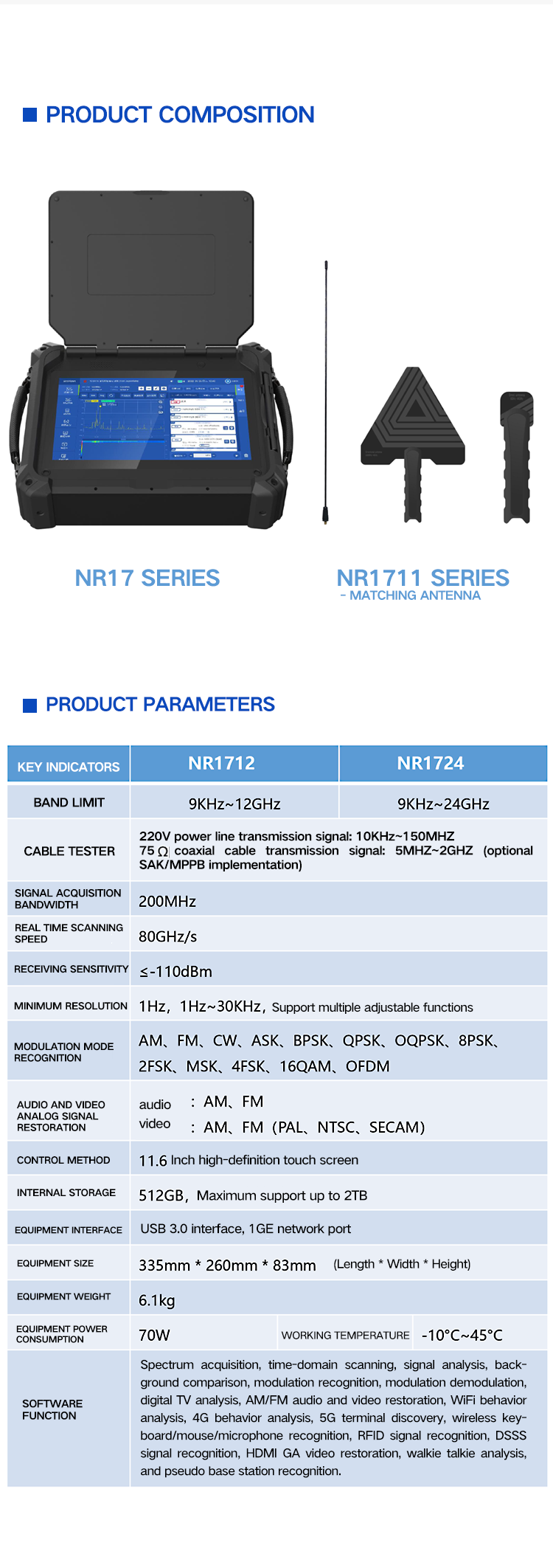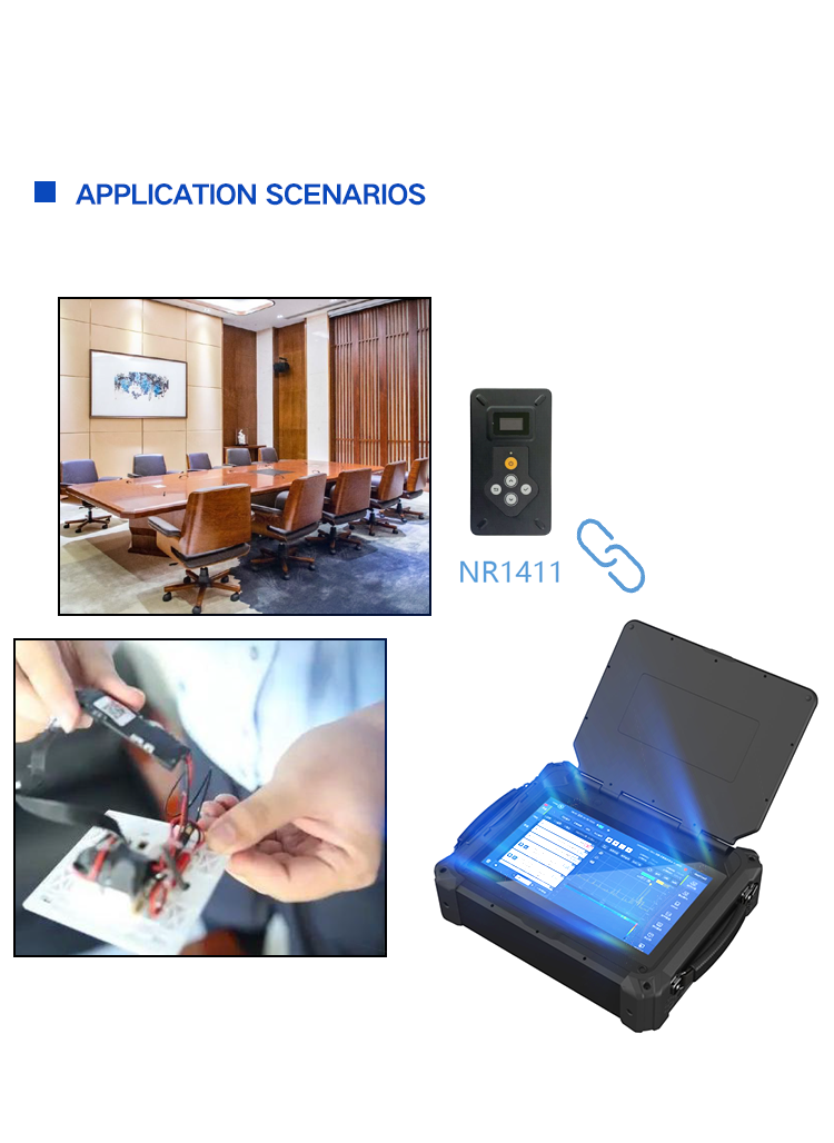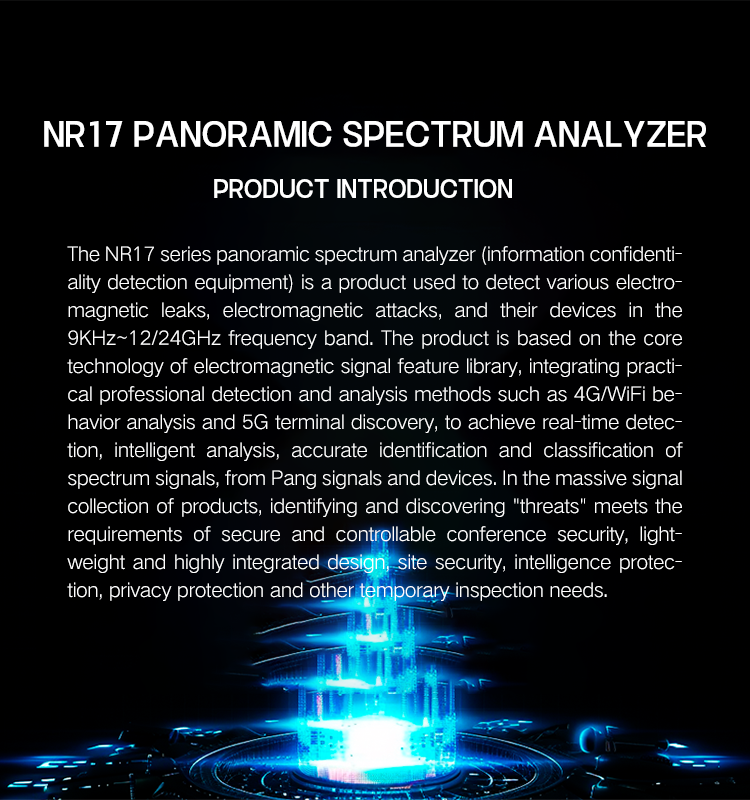 The NR17 series panoramic spectrum analyzer (information confidentiality detection equipment) is a product used to detect various types of espionage, electromagnetic leakage, electromagnetic attacks and their devices in the 9KHz~12/24GHz frequency band. On the basis of signal detection and discovery of traditional spectrum detection equipment, it further innovates and studies, focusing on the identification and discovery of "threats". The product is based on the electromagnetic signal feature library of core technology, integrating practical and practical professional detection and analysis methods such as 4G/WiFi behavior analysis and 5G terminal discovery, to achieve real-time detection, intelligent analysis, accurate identification and classification of spectrum signals,and identify and discover "threat" signals and devices from complex and massive signals. The product adopts a lightweight, highly integrated integrated design to meet the needs of safe and controllable conference security, venue security, intelligence protection, privacy protection and other inspection needs.