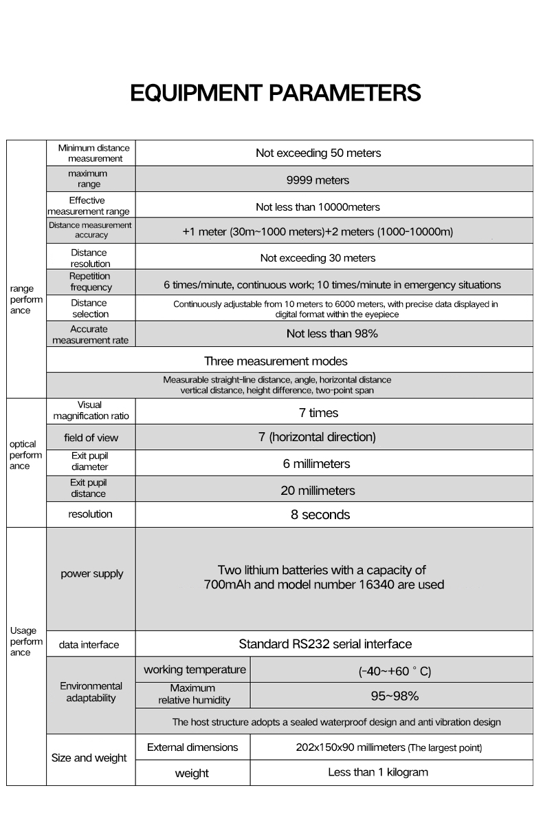 Handheld laser rangefinder is a set of modern electronics, optics, laser technology to accurately measure the distance of a new generation of military telescope rangefinder, with a small size, light weight, measuring range, easy to operate, ranging error is small, sealing performance is good, high reliability, applicable to military observation, navigation, riverbed, postal and electrical cables and power cables erected in the field of distance measurement, oil fields, land and mines, railroads and highway construction survey, and other areas of distance measurement. And set up a standard RS232 serial interface and mechanical coupling port, can easily realize the signal transmission, and goniometer instrument with the realization of the target orientation determination.