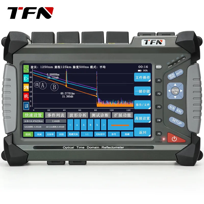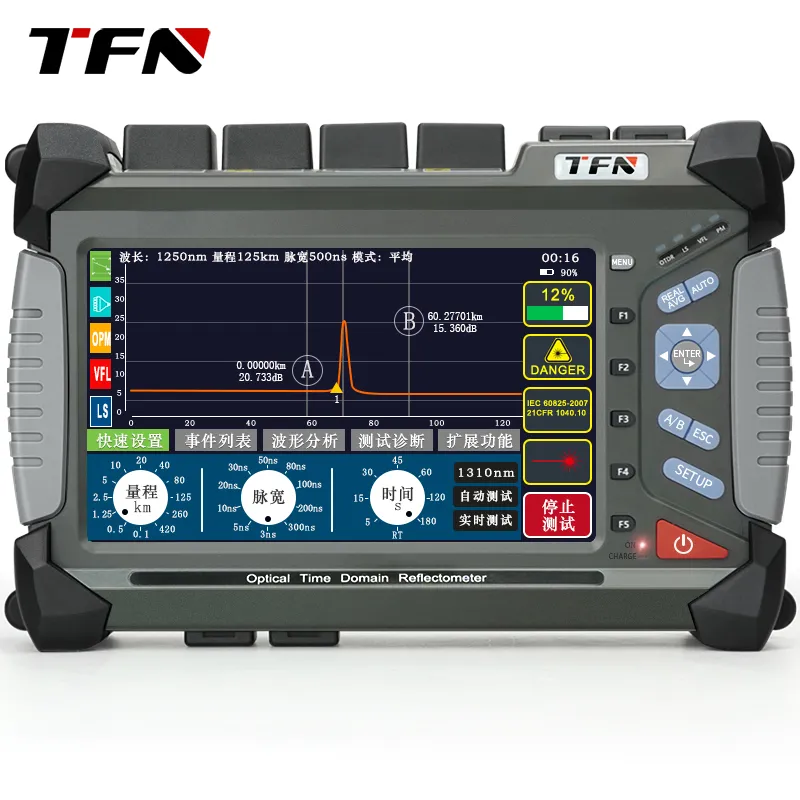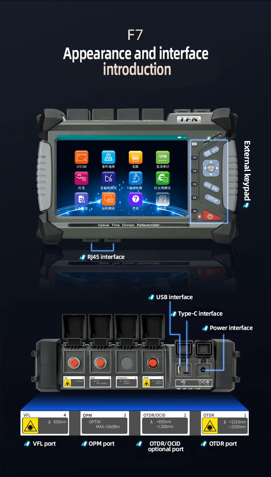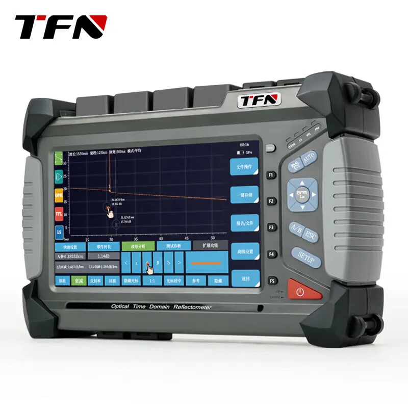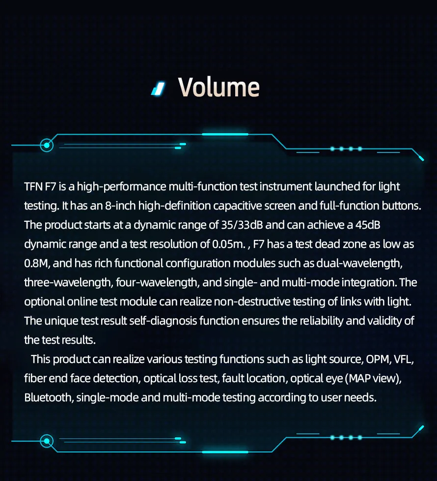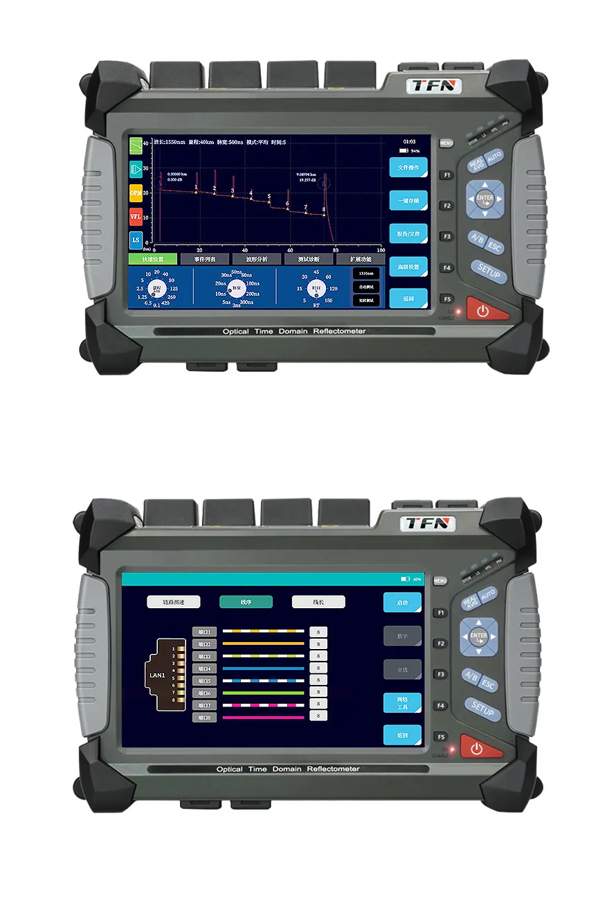 F7 OTDR (Optical Time Domain Reflectometer) is a high-performance multi-function test instrument launched for optical fiber testing. It has an 8-inch high-definition capacitive screen and full-function buttons. The product has a starting dynamic range of 35/33dB and can achieve a maximum dynamic range of 45dB and a maximum measurement range of 0.05m distance resolution, with a minimum test blind zone of 0.8m, and rich configuration function modules such as dual-wavelength, three-wavelength (for active fiber online test), four-wavelength, and single-mode and multi-mode integration. The optional online test module can achieve lossless link light Test, the unique test result self-diagnosis function greatly ensures the reliability and validity of the test results.