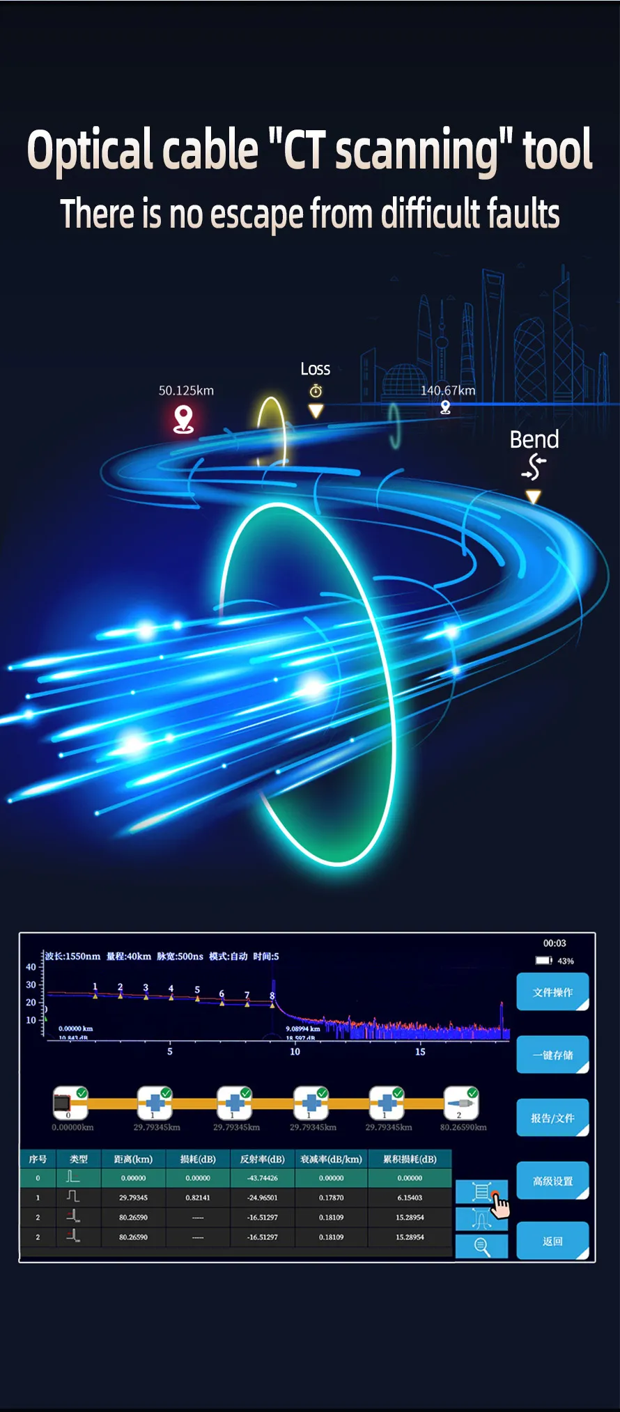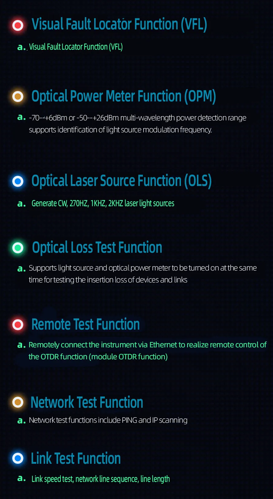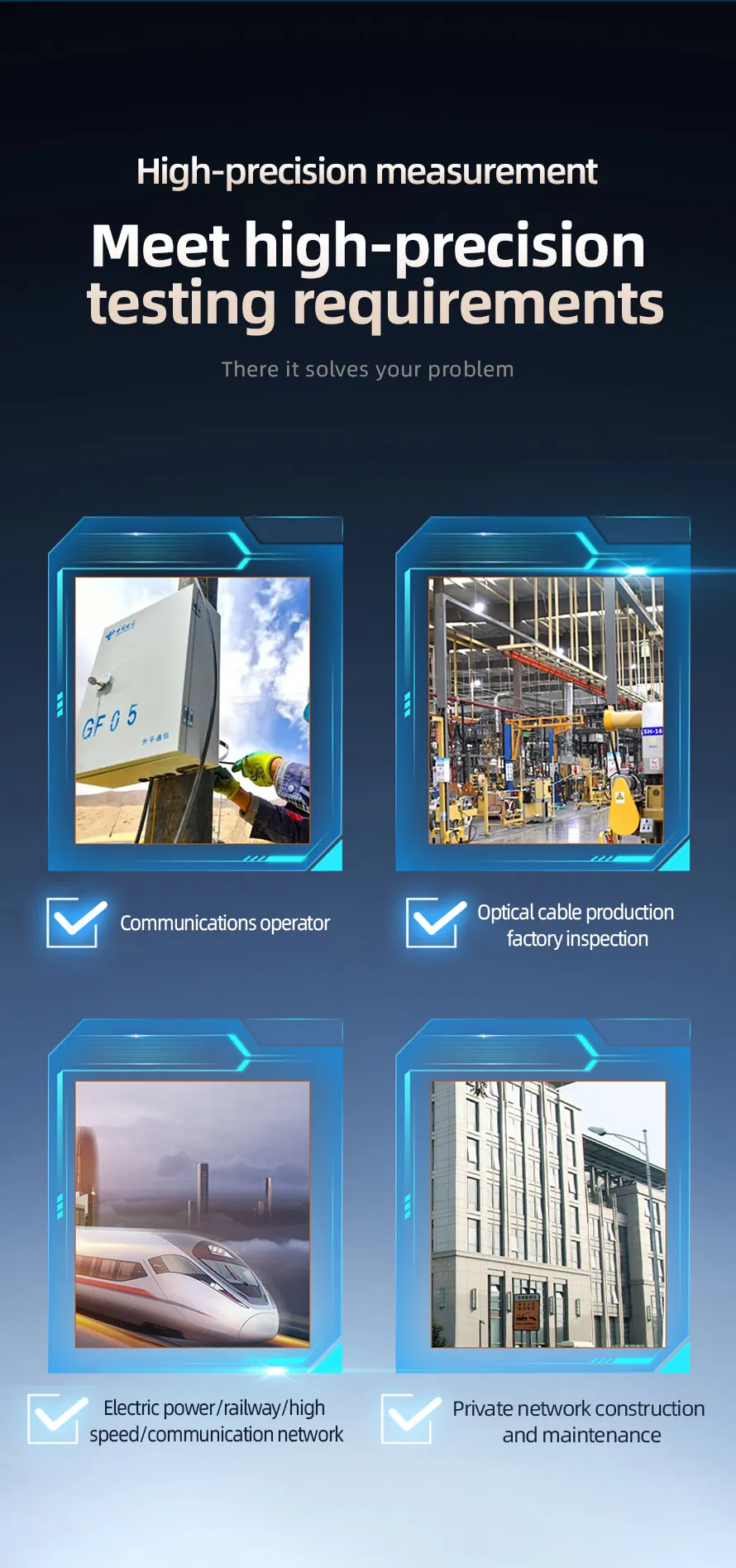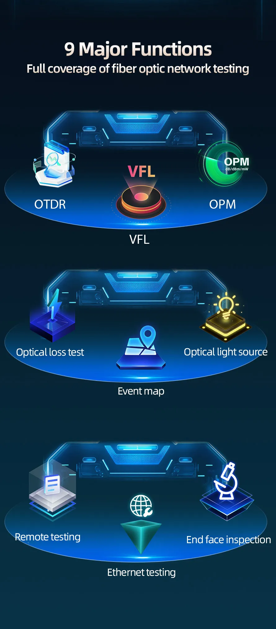 This OTDR tester can realize various testing functions such as optical laser source, optical power meter, VFL, fiber microscope, optical loss test, fault location, photoeye (MAP view), Bluetooth, single-mode and multi-mode testing according to user needs.