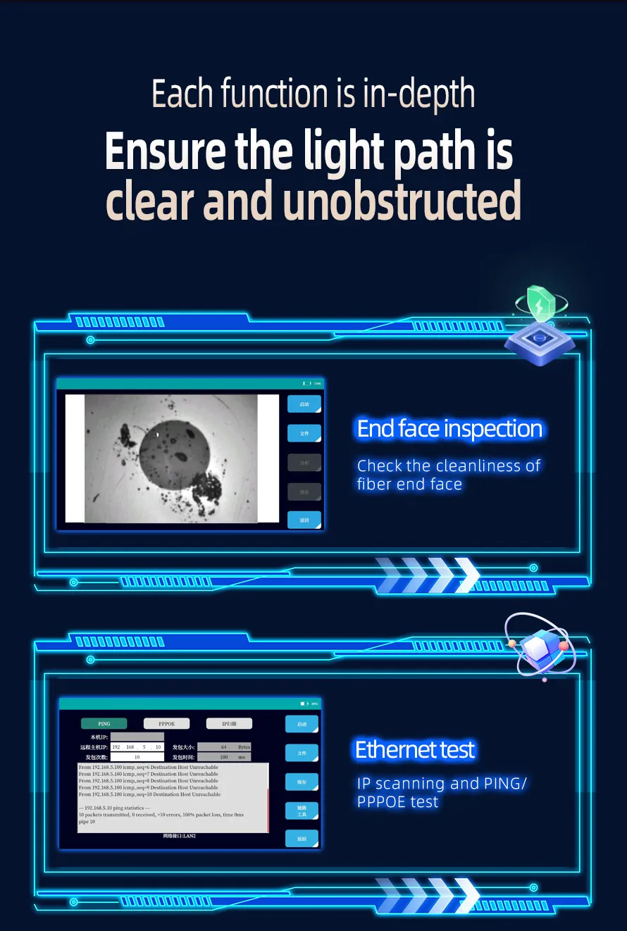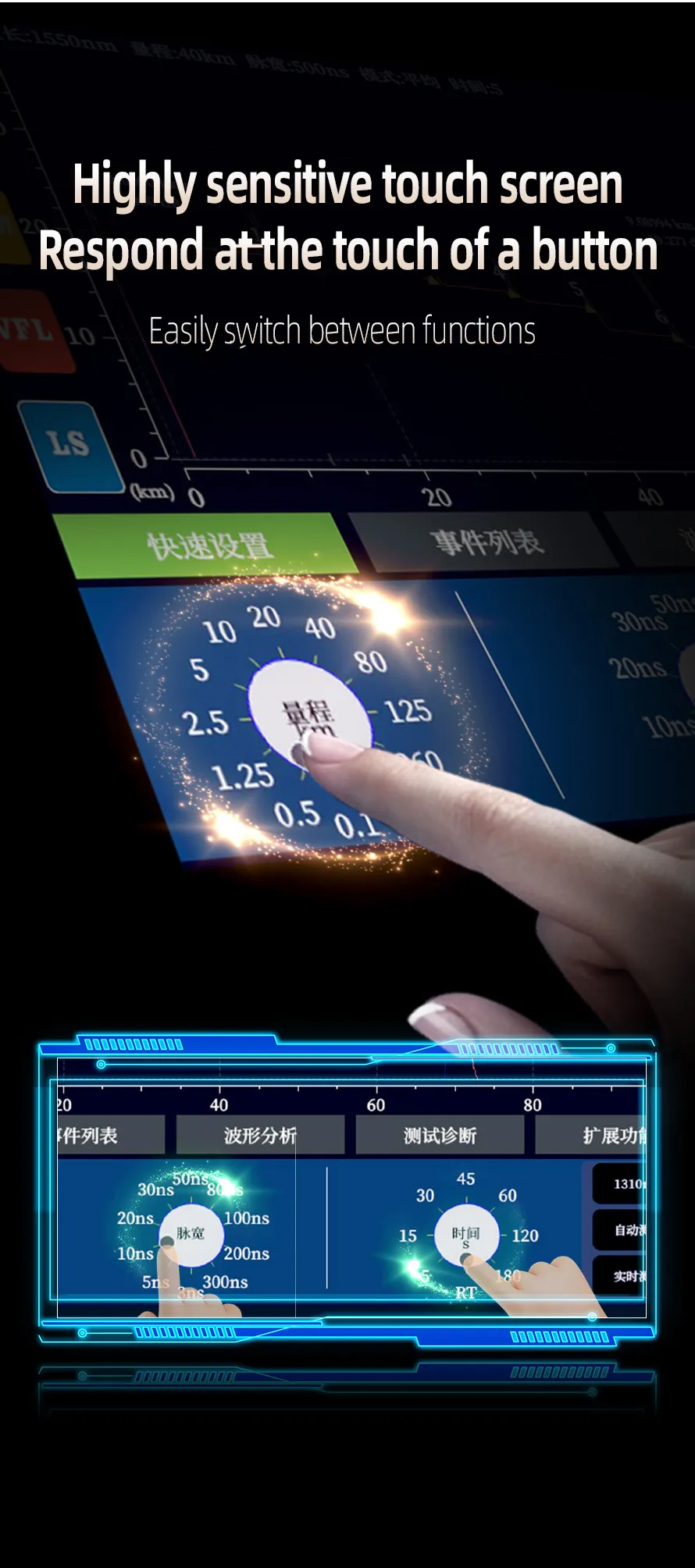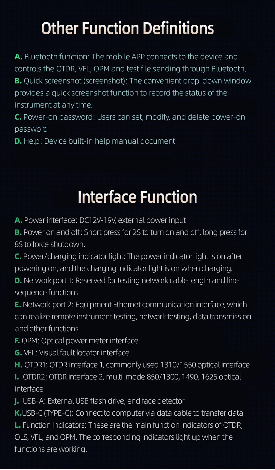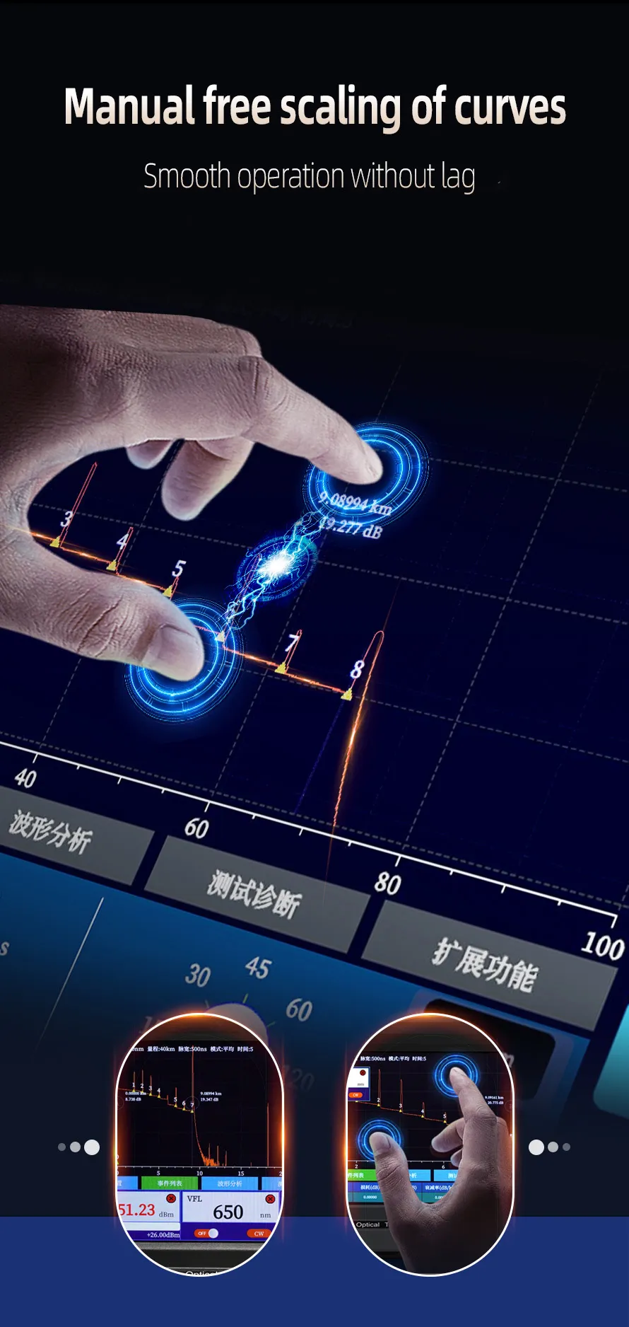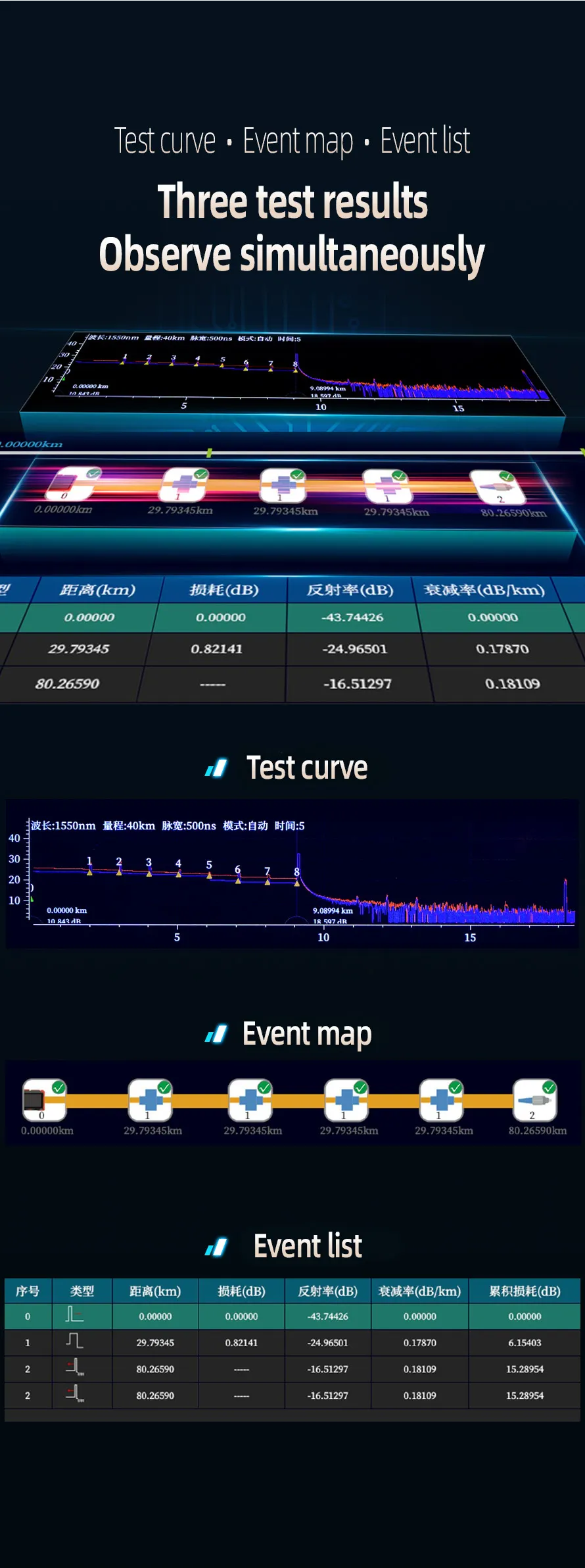 This OTDR tester can realize various testing functions such as optical laser source, optical power meter, VFL, fiber microscope, optical loss test, fault location, photoeye (MAP view), Bluetooth, single-mode and multi-mode testing according to user needs.