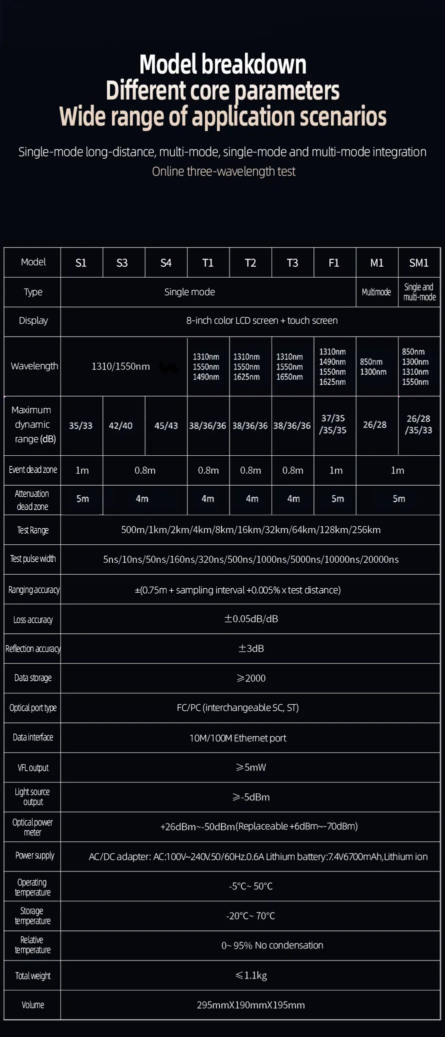 | Wavelength | 1310/1550nm | 1310/1550nm | 1310/1550nm | 850/1300nm | 850/1300/1310/1550nm |