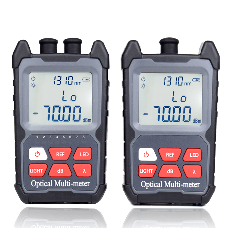 The handheld optical power meter & visual fault locator all-in-one series are mainly used for continuous optical signal power measurement, optical fiber link loss test and optical fiber line continuity test. It is controlled by a single-chip microprocessor and has complete functions. It is widely used in optical cable construction and maintenance, optical fiber communication, optical cable sensing, optical CATV and other fields. The body design meets the requirements of ergonomics and adopts advanced thermoplastic molding technology, which is beautiful and durable. The optical power meter & visual fault locator all-in-one uses embedded detectors and lasers to protect it well. The all-in-one has a small appearance, automatic shutdown function, three red light modes, backlight display, wavelength memory function, optical fiber working identification, support user calibration, wide test range, and support lighting.