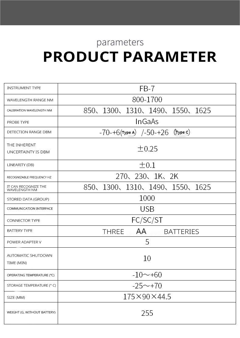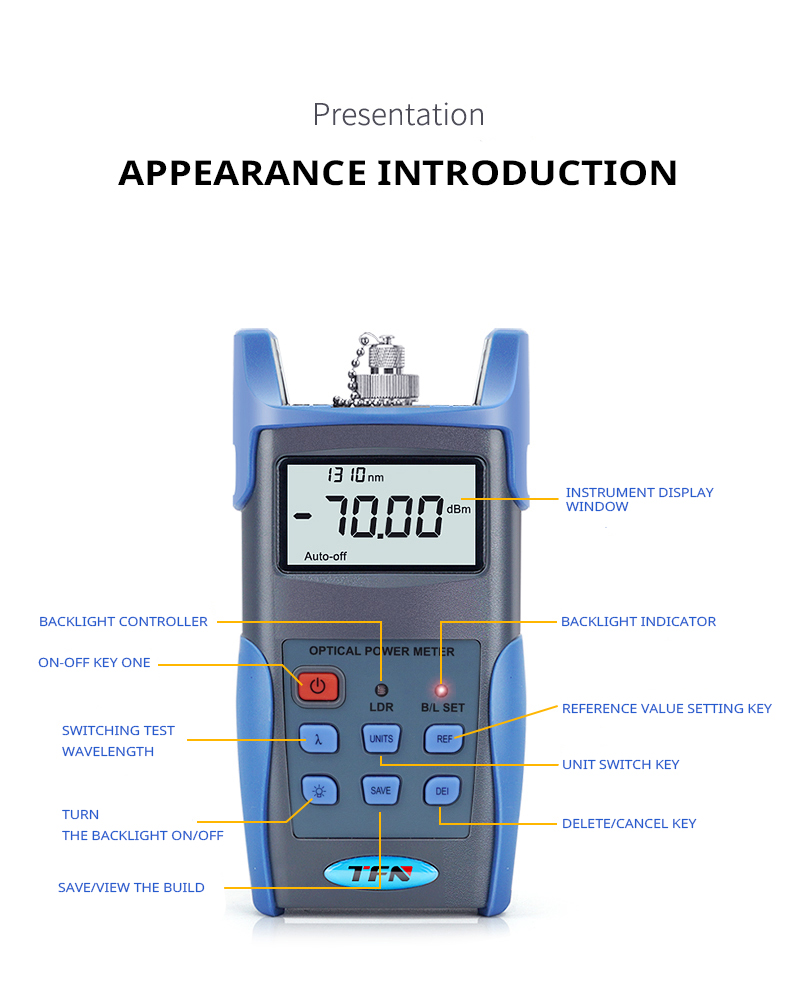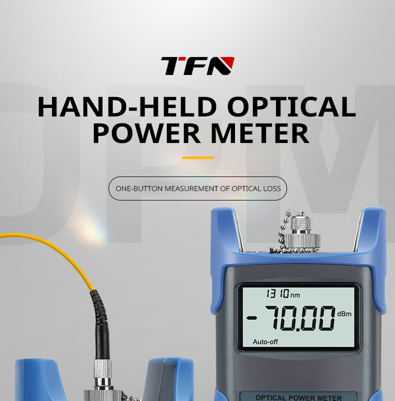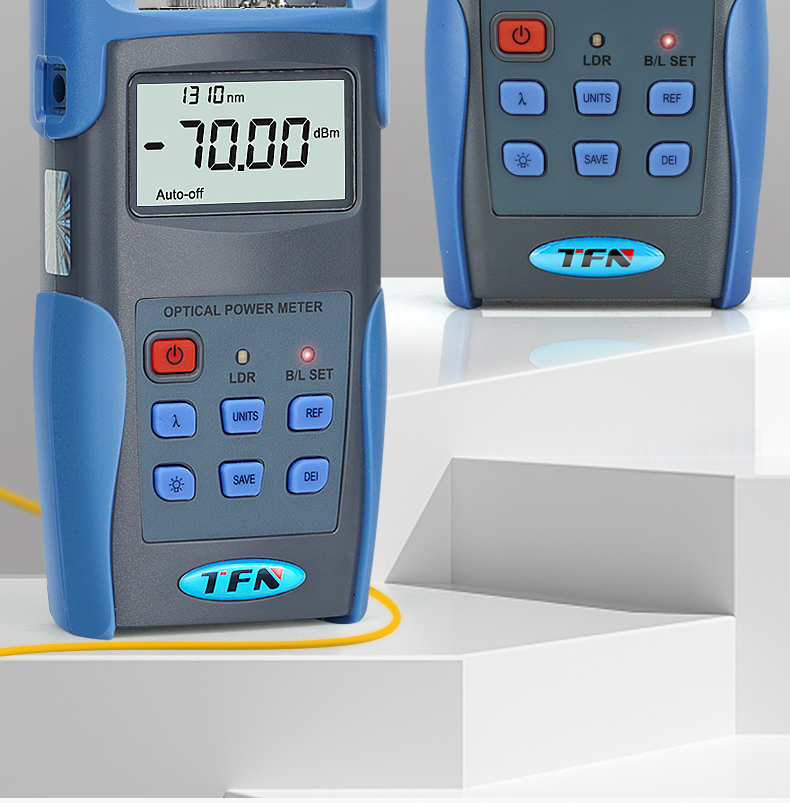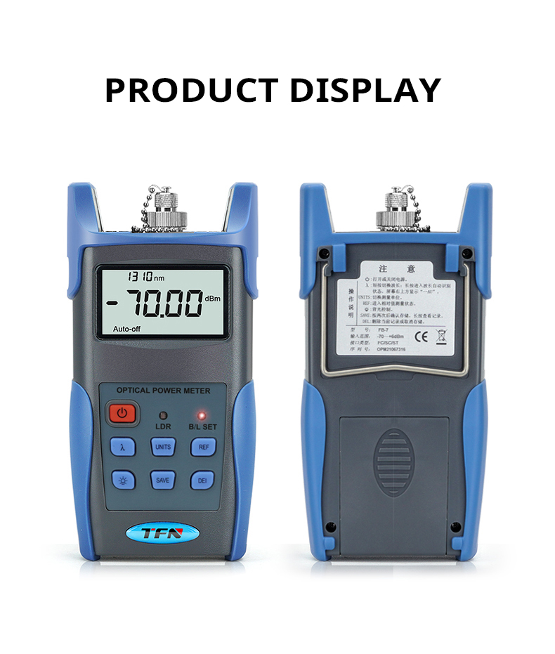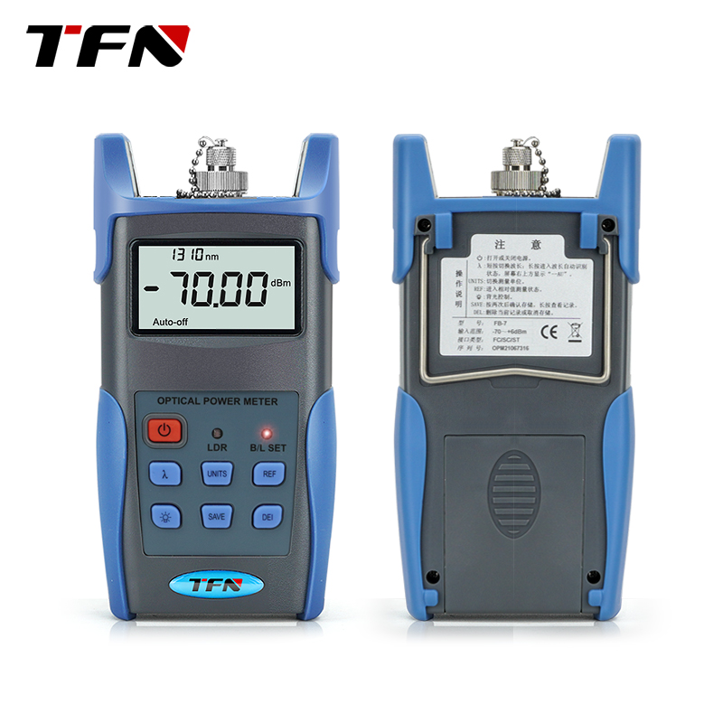 TFN FB-7 handheld optical power meter is a newly designed product for the installation, acceptance and maintenance of optical fiber networks. When used with a handheld light source, it can provide you with a solution for accurate testing of optical fiber networks. New wavelength identification and frequency detection functions are added, and the backlight intelligent control design is environmentally friendly and energy-saving. The appearance is smooth, the feel is good, and the considerate humanized design meets the greatest needs of users.