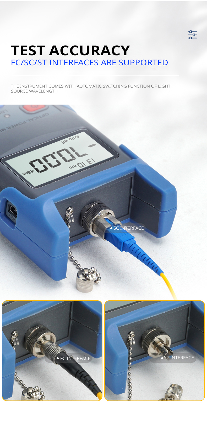 The light source can send wavelength identification information, and the optical power meter can automatically identify the wavelength used and then switch to the appropriate calibration parameters. This function can be used for long-distance optical power testing to prevent the wavelength test of the light source and the optical power meter from being inconsistent and reduce the error rate.