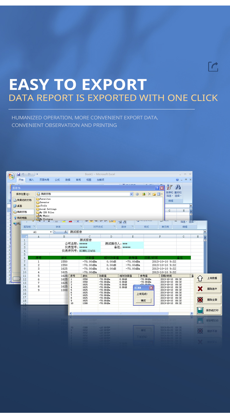 The application software of the optical power meter has two functional interfaces: data processing and instrument setting. The data processing interface can be used to upload the data saved in the instrument to the computer, which is more convenient for users to view and process data (including deletion, saving, and printing). Through the instrument setting interface, the instrument can be set for user self-calibration, time setting, and other functions.
