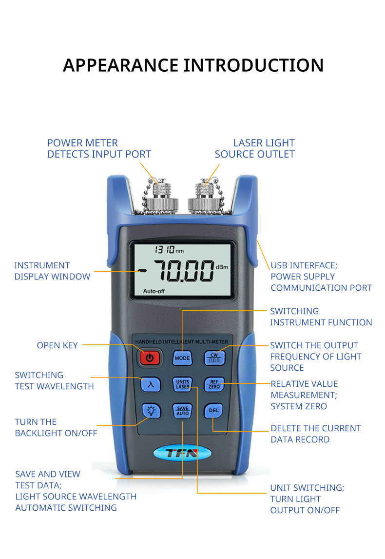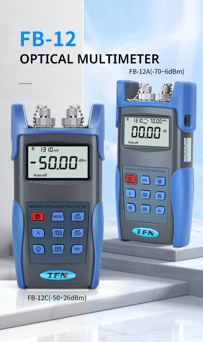 TFN FB12 optical multimeter has the functions of optical power meter and light source, and can store and upload the data recorded by the instrument test; it is widely used in the construction, detection and maintenance of optical fiber line projects such as digital data network, telecommunication network and cable TV.
