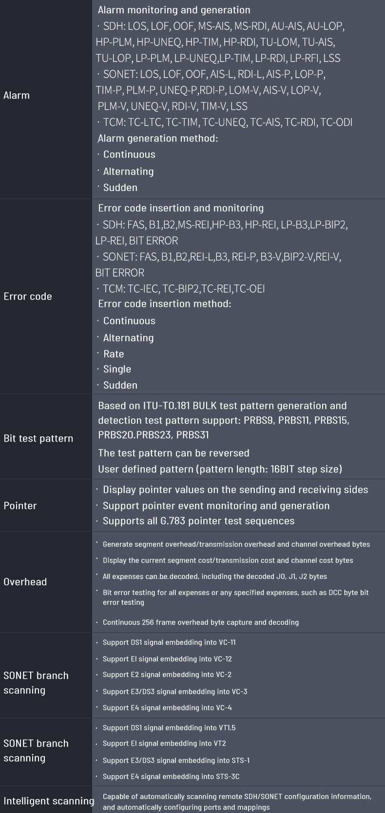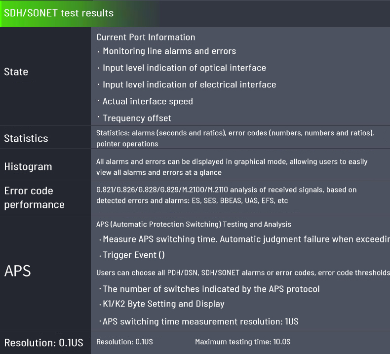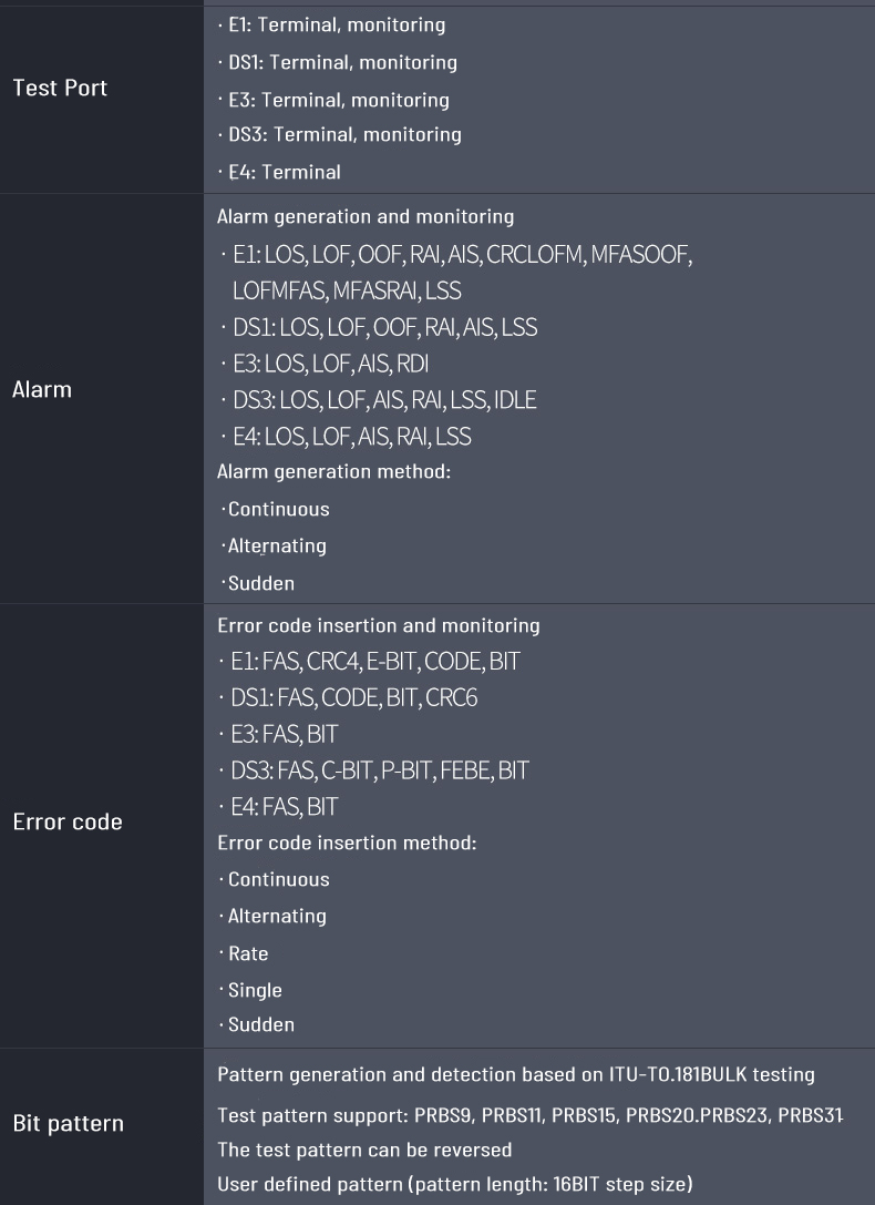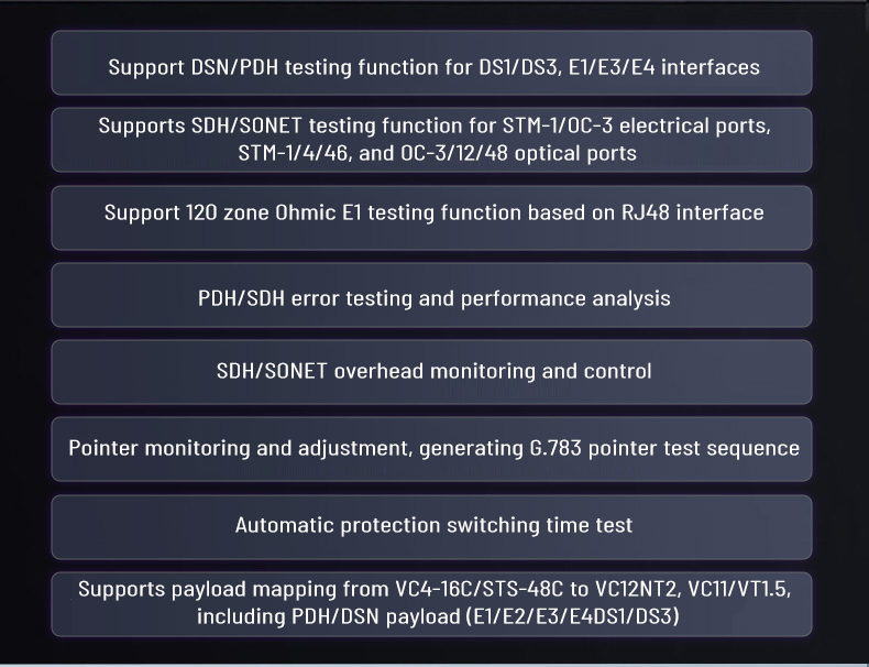 2. Support SDH/SONET test function for STM-1/OC-3 electrical port, STM-1/4/16 and OC-3/12/48 optical port