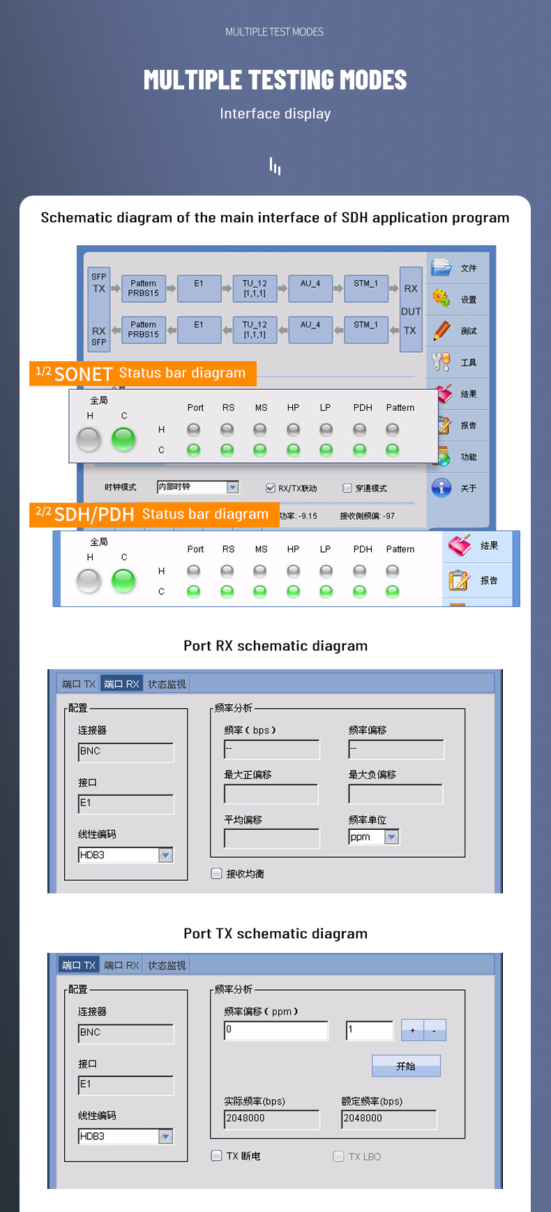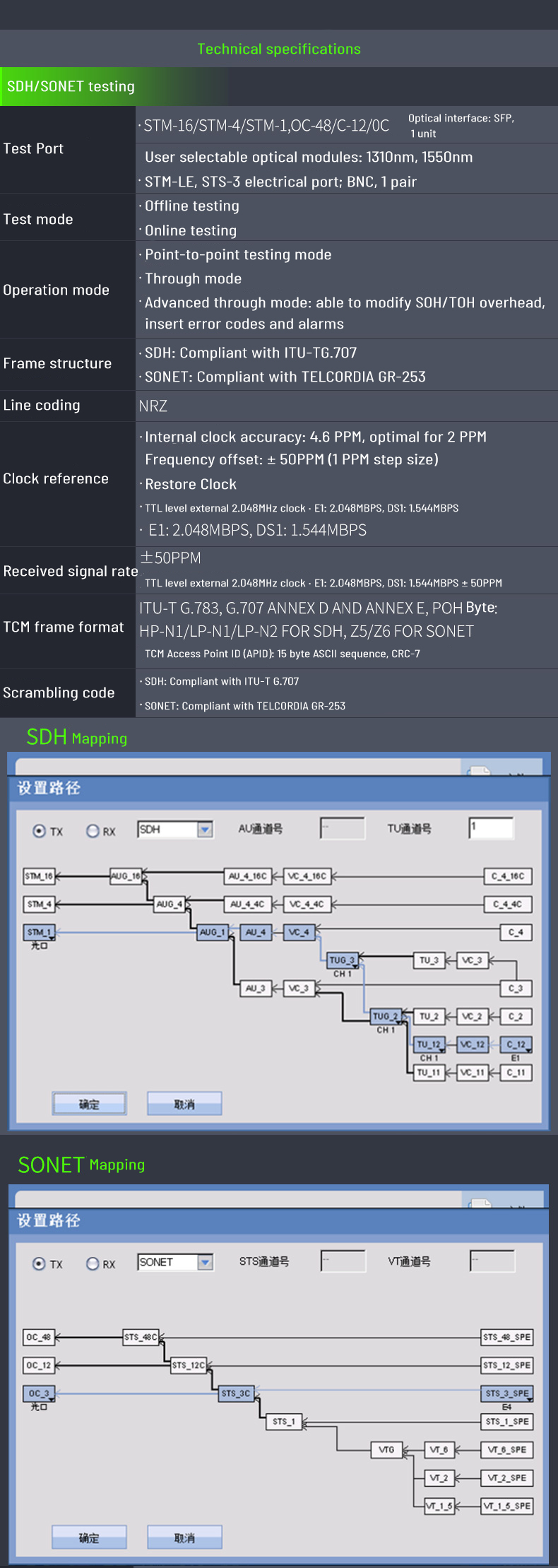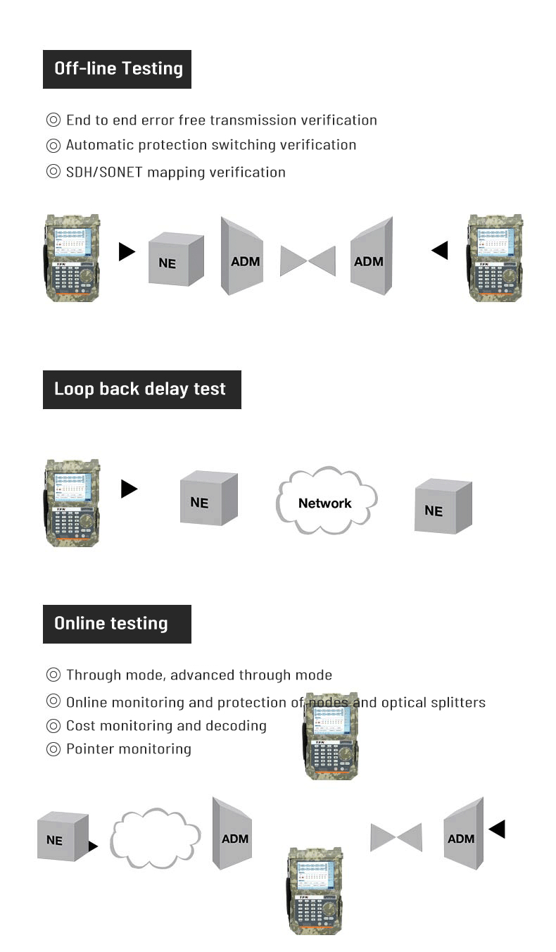 2. Support SDH/SONET test function for STM-1/OC-3 electrical port, STM-1/4/16 and OC-3/12/48 optical port
