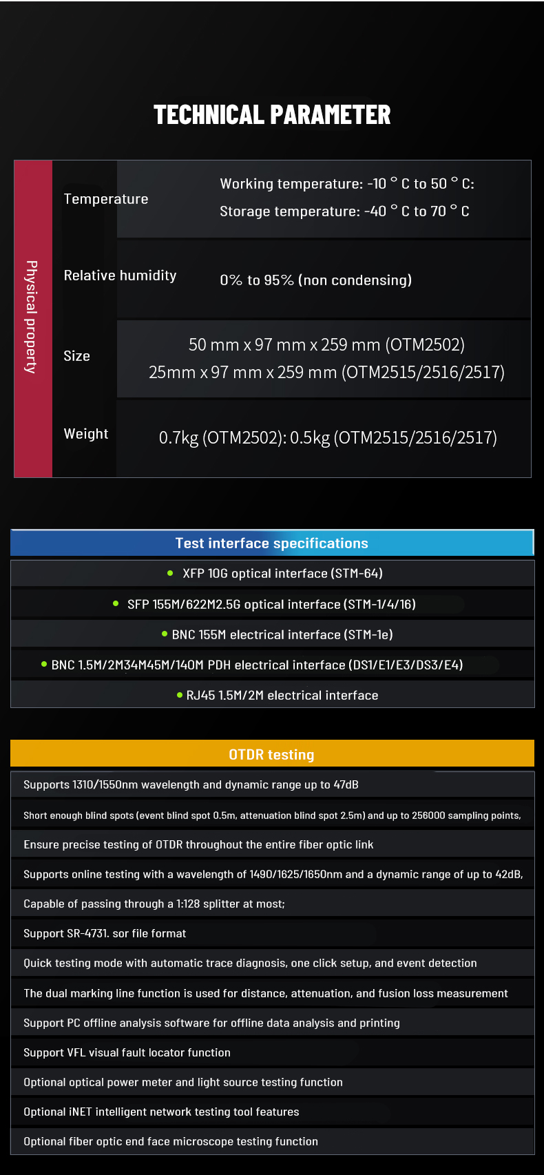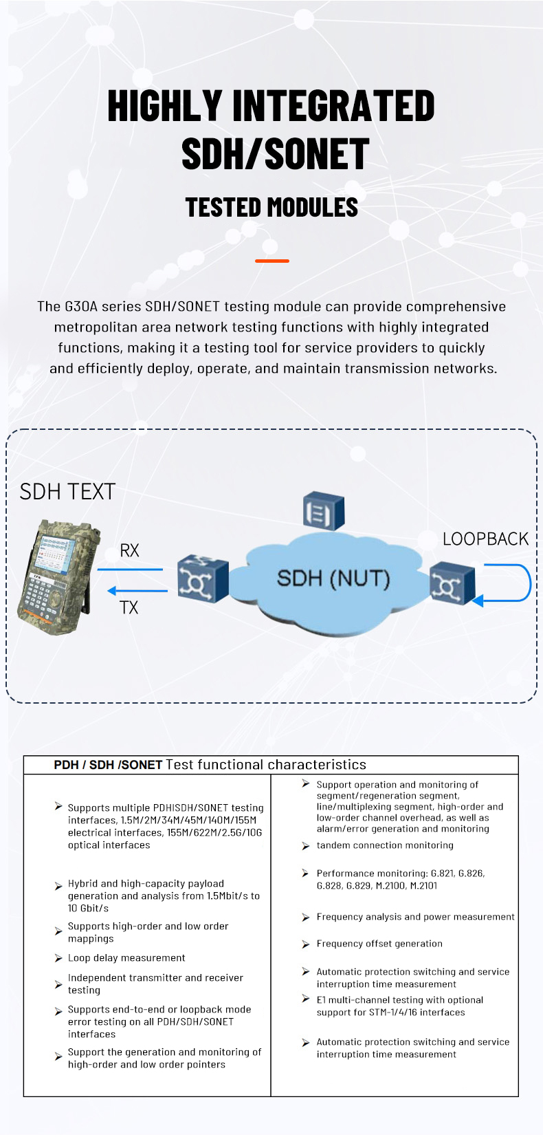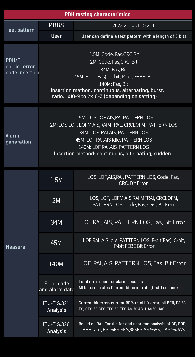 2. Support SDH/SONET test function for STM-1/OC-3 electrical port, STM-1/4/16/64 and OC-3/12/48 optical port