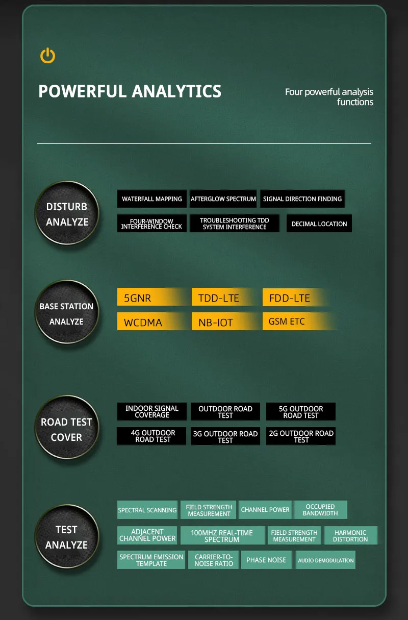 2. Main Functions: Spectrum analysis, Interference analysis, Base station analysis, Road test coverage