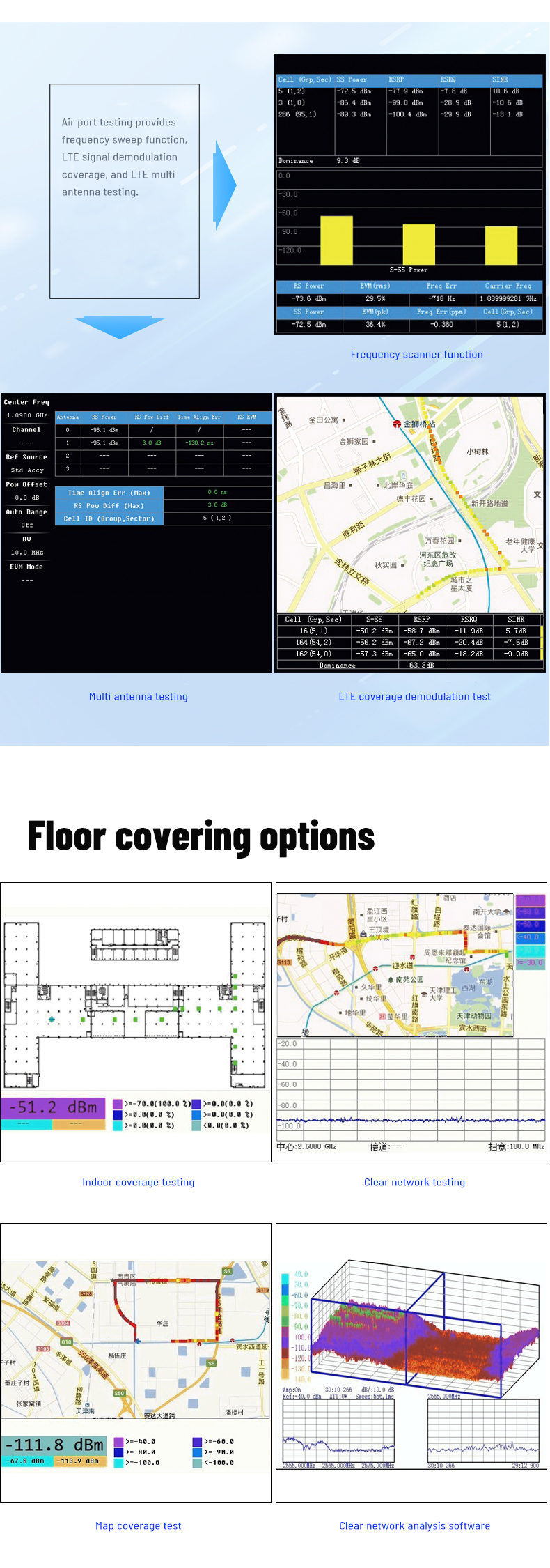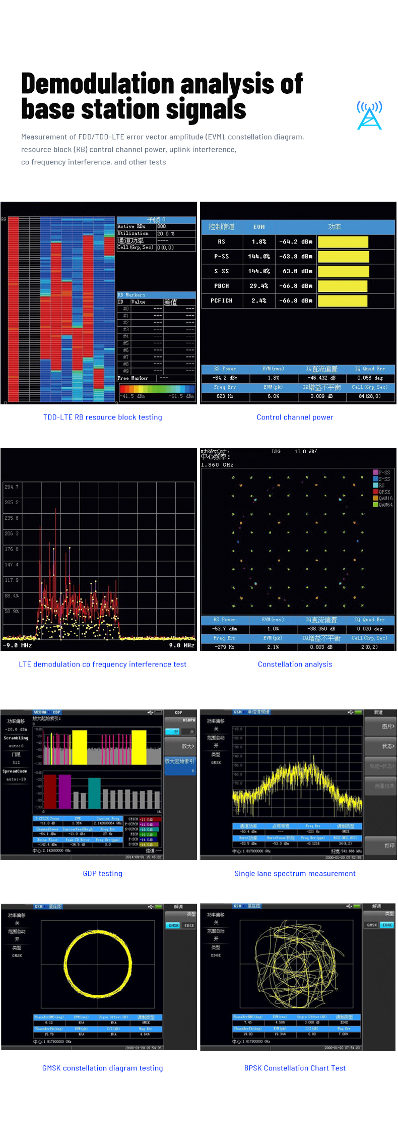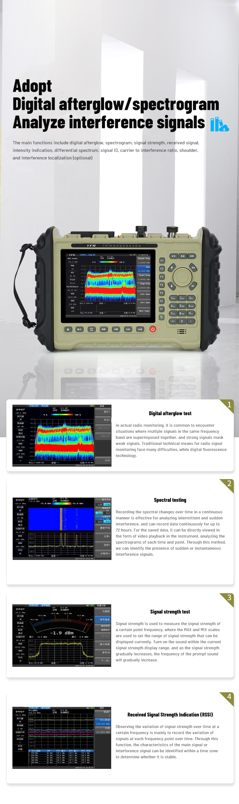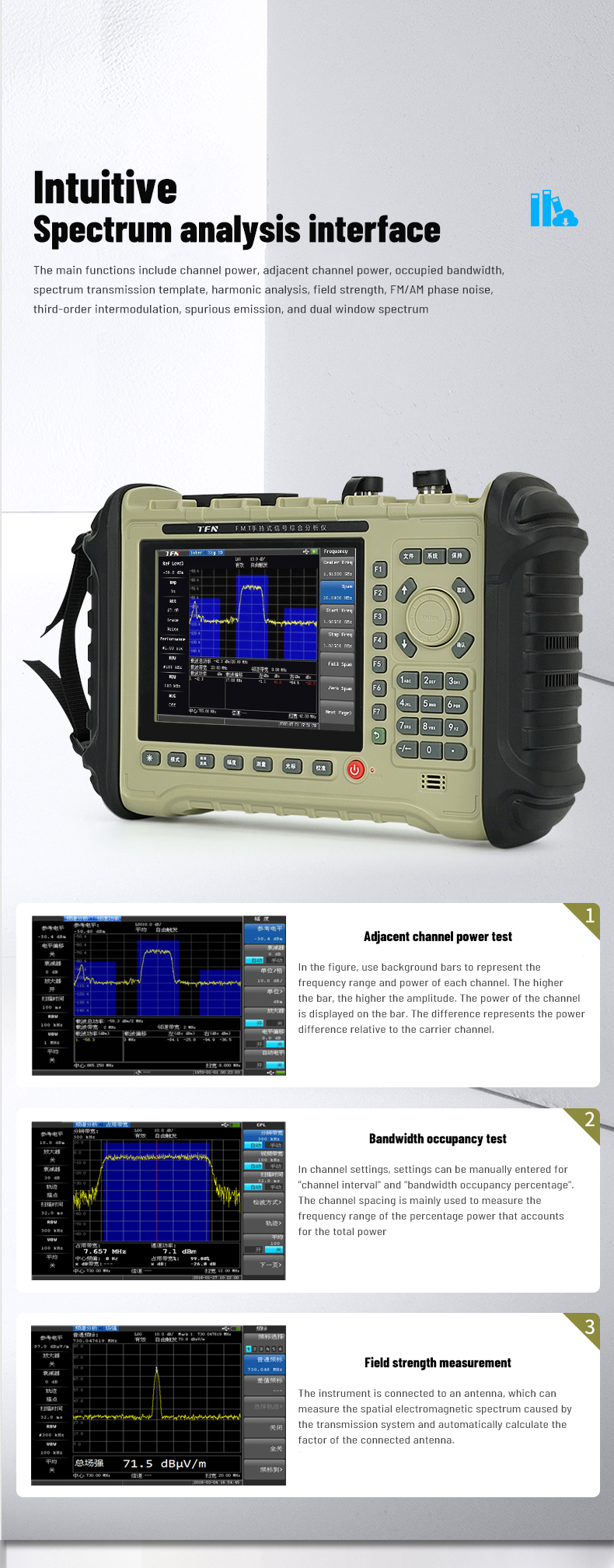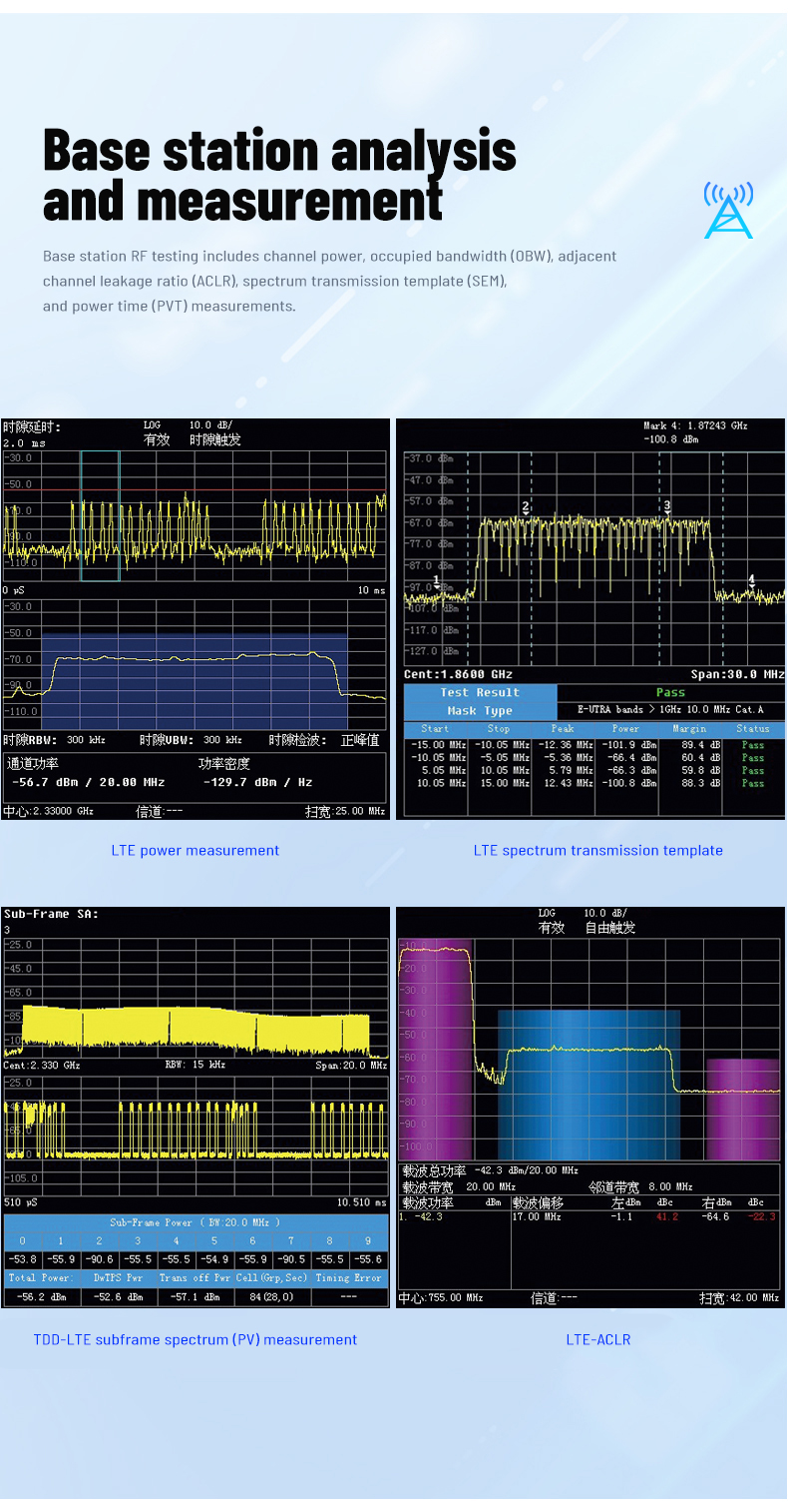 Spectrum analysis is used for spectrum detection, interference analysis, field strength testing, 2G/3G/4G cellular station field