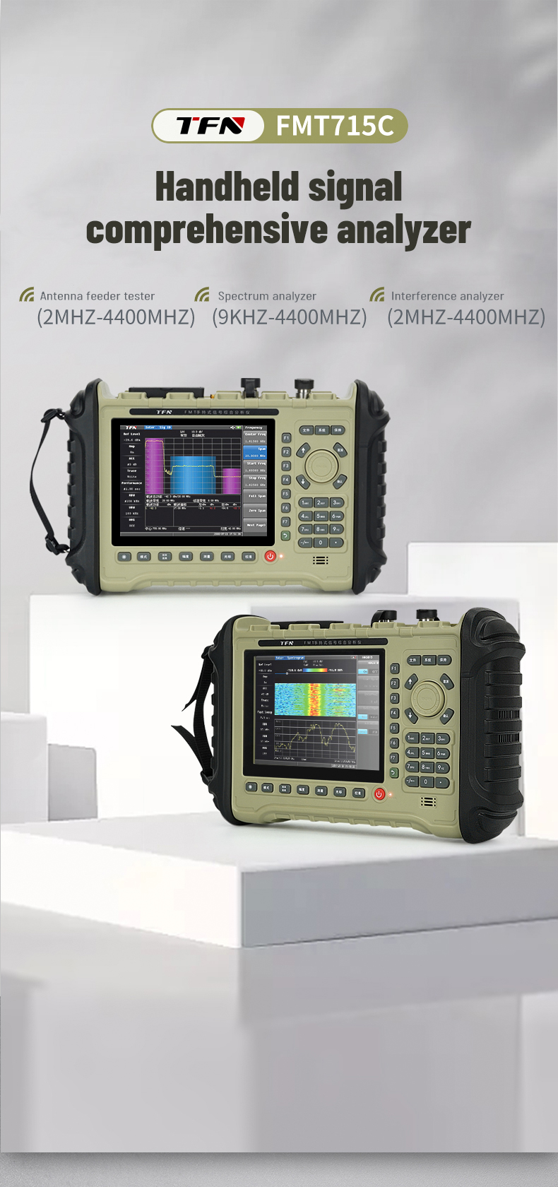 The FMT715C wireless comprehensive tester is a handheld, comprehensive instrument for antenna, feeder and cable testing