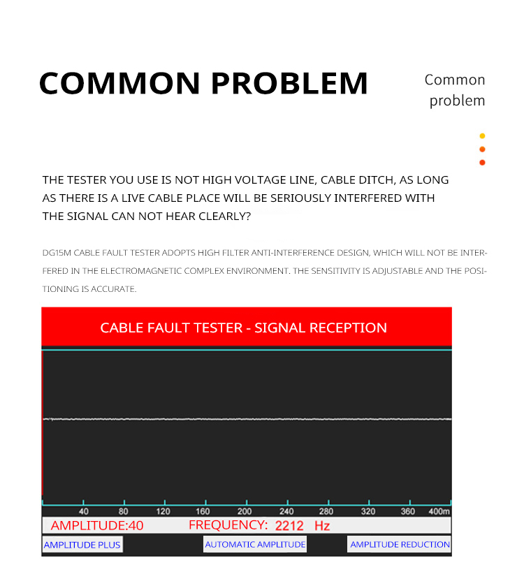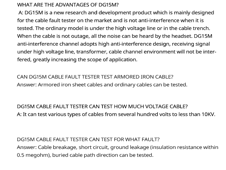 TFN DG15M mainly for the market cable fault tester test is not anti-interference and the development of a high interference type cable fault tester, anti-interference channel using high interference design, high-voltage lines, transformers, cable trench environment to receive signals will not be interfered with.