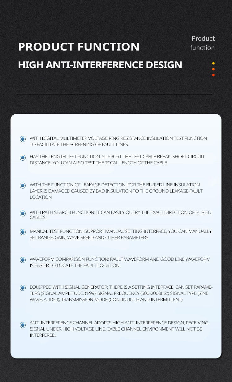 2, with length test function: support the test cable line breakage, short-circuit distance; can also test the total length of the cable line.