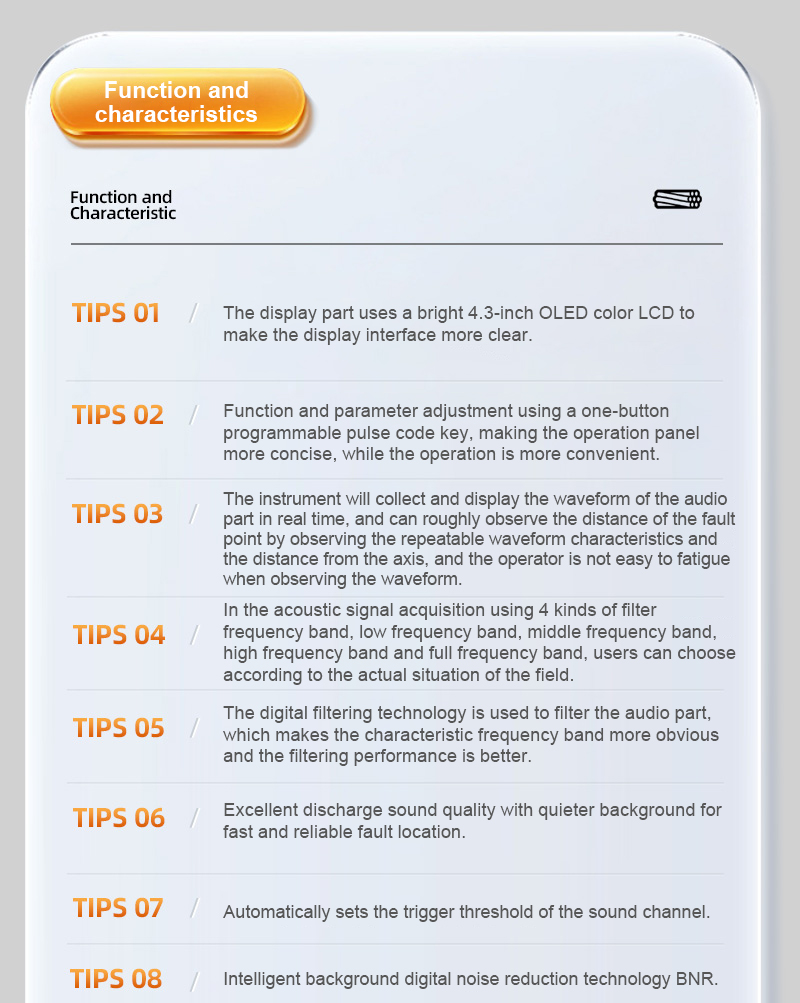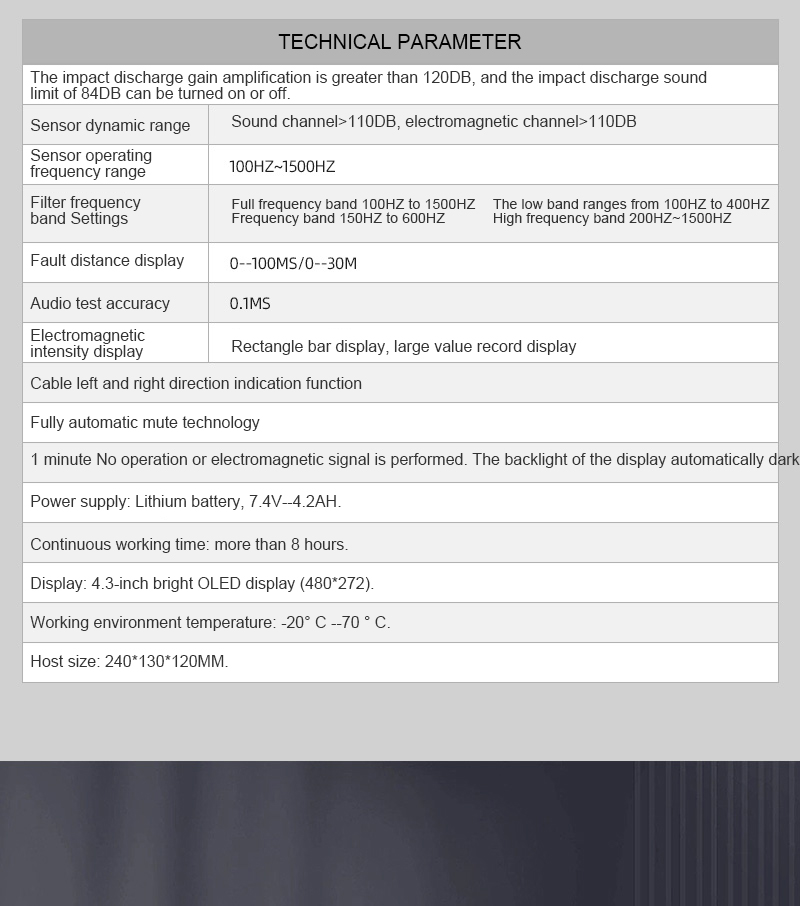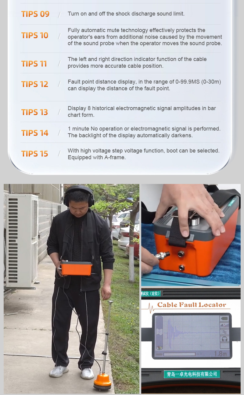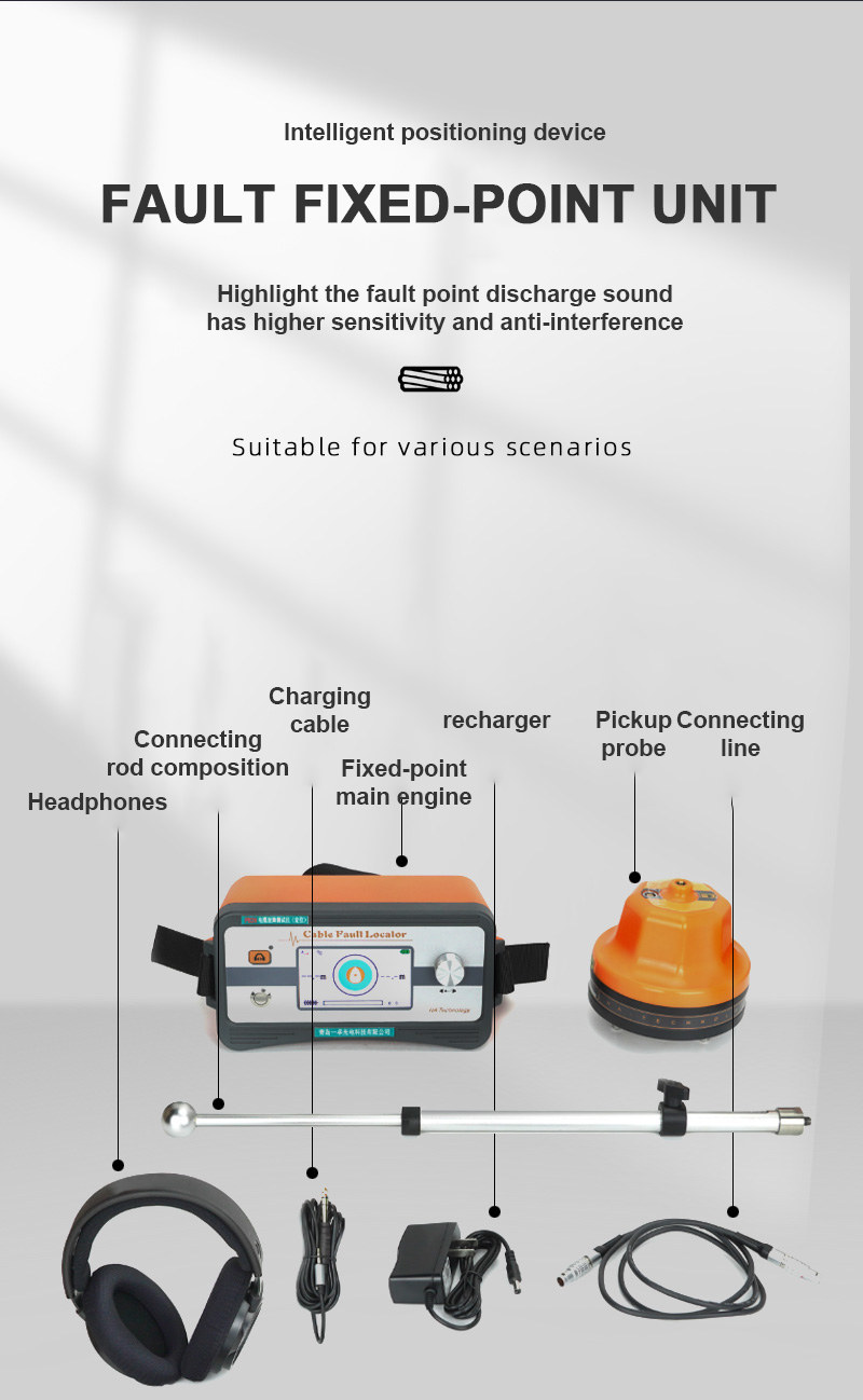 The PTR30 fixed-point instrument is equipped with first-class integrated circuits and amplifiers. Filters on the instrument's sound channel maximize the removal of interfering noise, while enhancing the sound generated by the arc. The LCD display shows both acoustic and magnetic pulses and the distance of the fault point from the probe test point. The instrument is composed of five parts: electromagnetic wave sensor, acoustic vibration sensor, CPU data processor, liquid crystal display and audio amplifier.