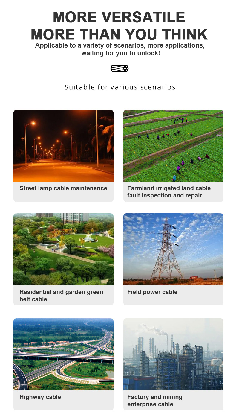 FB28 cable fault tester includes cable fault ranging unit, pathfinding and identification unit, high-voltage signal unit, fault location unit, a total of four units, can be applied to a variety of scenarios, such as farmland watering cable fault checking and repairing, highways, community property and landscaping green belts, street lamp cable maintenance, field power cables, factories, mines and enterprises and other scenarios.