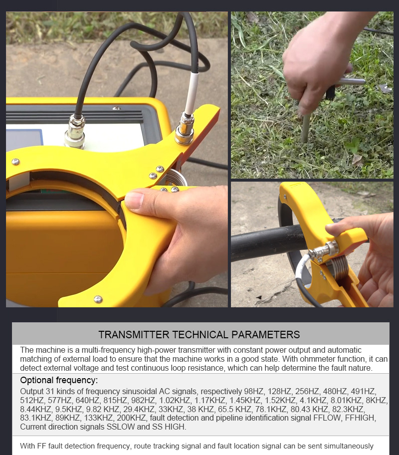 Path unit is divided into transmitter and receiver, is based on the principle of reflection of electromagnetic waves in the transmission process and the principle of electromagnetic induction, combined with digital filtering, wireless reception, software control and design of high-tech products. The signal of the transmitter is directly applied to the target cable (blackout cable) by a direct line, i.e. the direct connection method. Detecting the path is one of the main roles of this instrument, different sites can choose a different way of applying the signal, the choice of priority is: direct connection. The reception and detection of the signal is not affected by the method of signal application, and the operation is the same.
