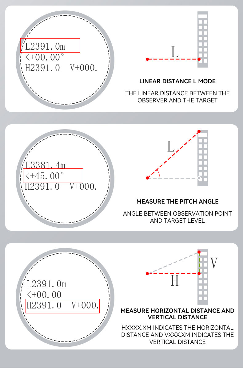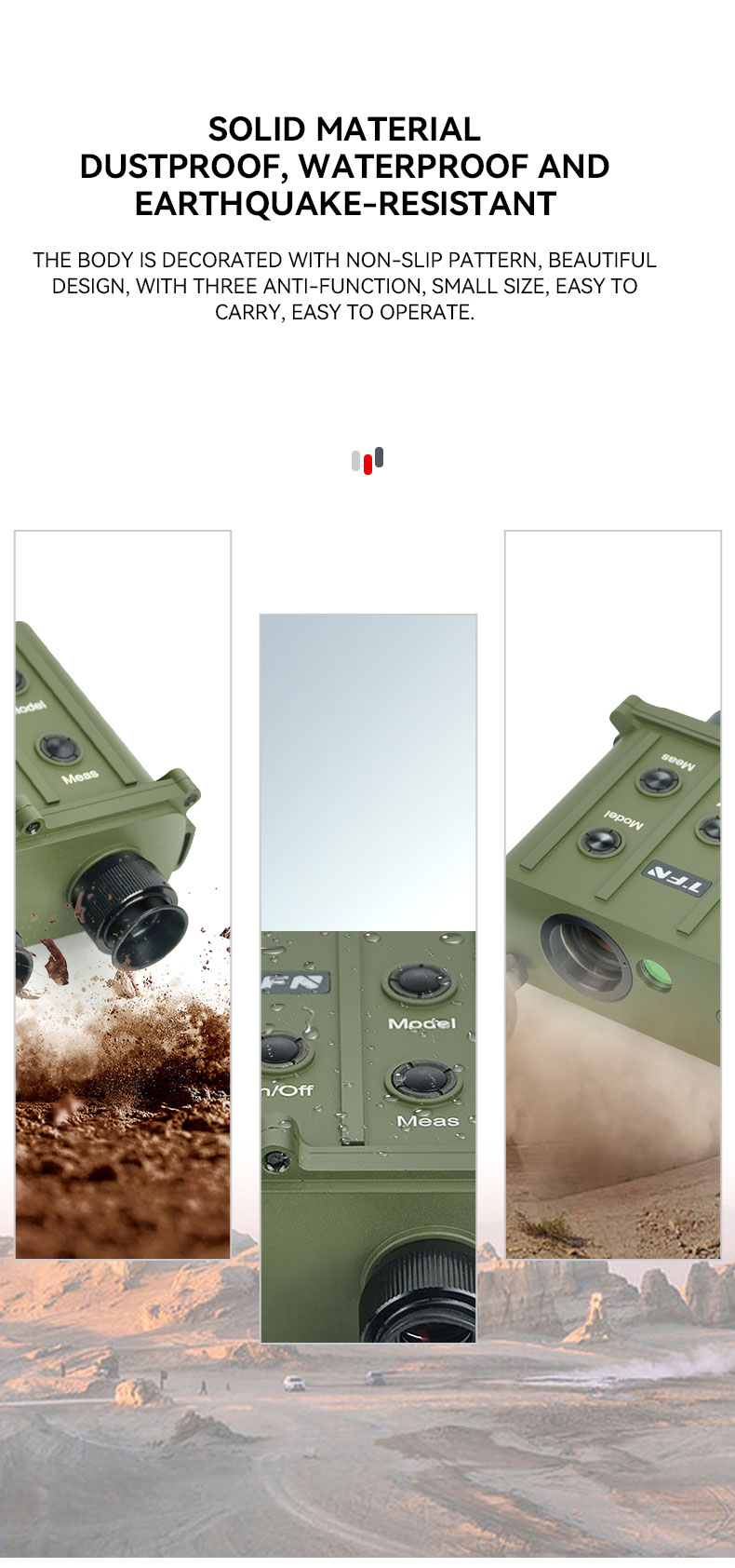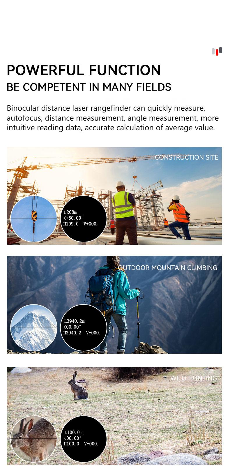 Handheld laser rangefinder is a new generation of military telescope rangefinder with modern electronic, optical and laser technologies to accurately measure the distance, featuring small size, light weight, long range, easy operation, small ranging error, good sealing performance, high reliability and so on, it is suitable for distance measurement in the fields of military observation, navigation, riverbed, postal and electrical cables and power cables erection, oil field, land and mining, railroads and highway construction survey and so on. With three hard core functions including distance measurement, elevation angle, horizontal / vertical distance.